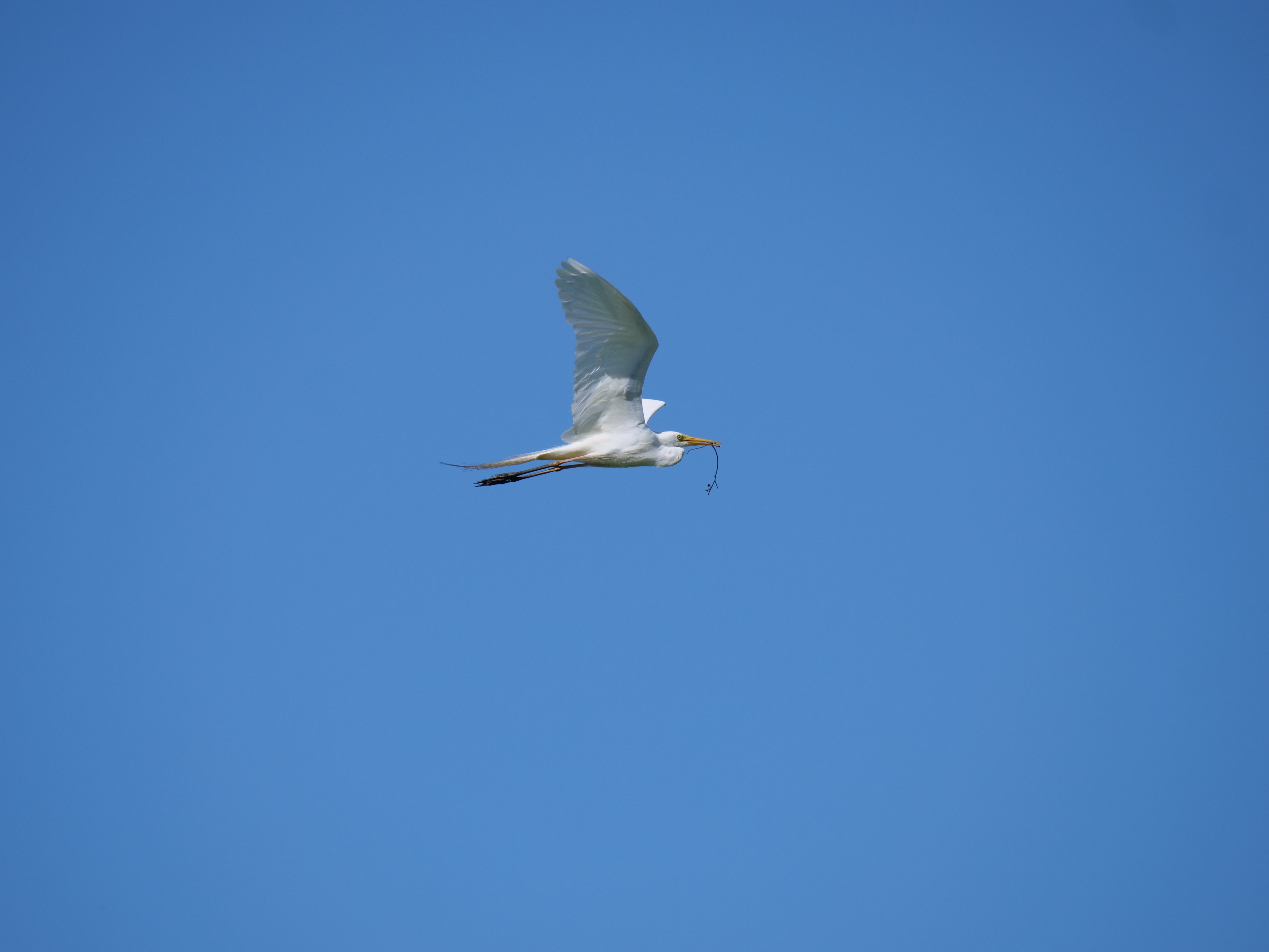 While not one of the better shots I have taken, under the circumstances and for various reasons it snuck in - I liked the bird's aspect, the translucence of the wing feathers showing some blue sky, the fine tail feathers showing the bird's battle with a strong headwind and the twig (@minniev I don't know the difference between a home building twig or a courting twig). A little bit of wing tip motion blur doesn't normally bother me. It wasn't over exposed in white areas as is so often the case with white birds in sunlight and the shadows under the wings weren't too deep. It was sharp enough. Not what the lens is capable of but in flight is not so easy to get.