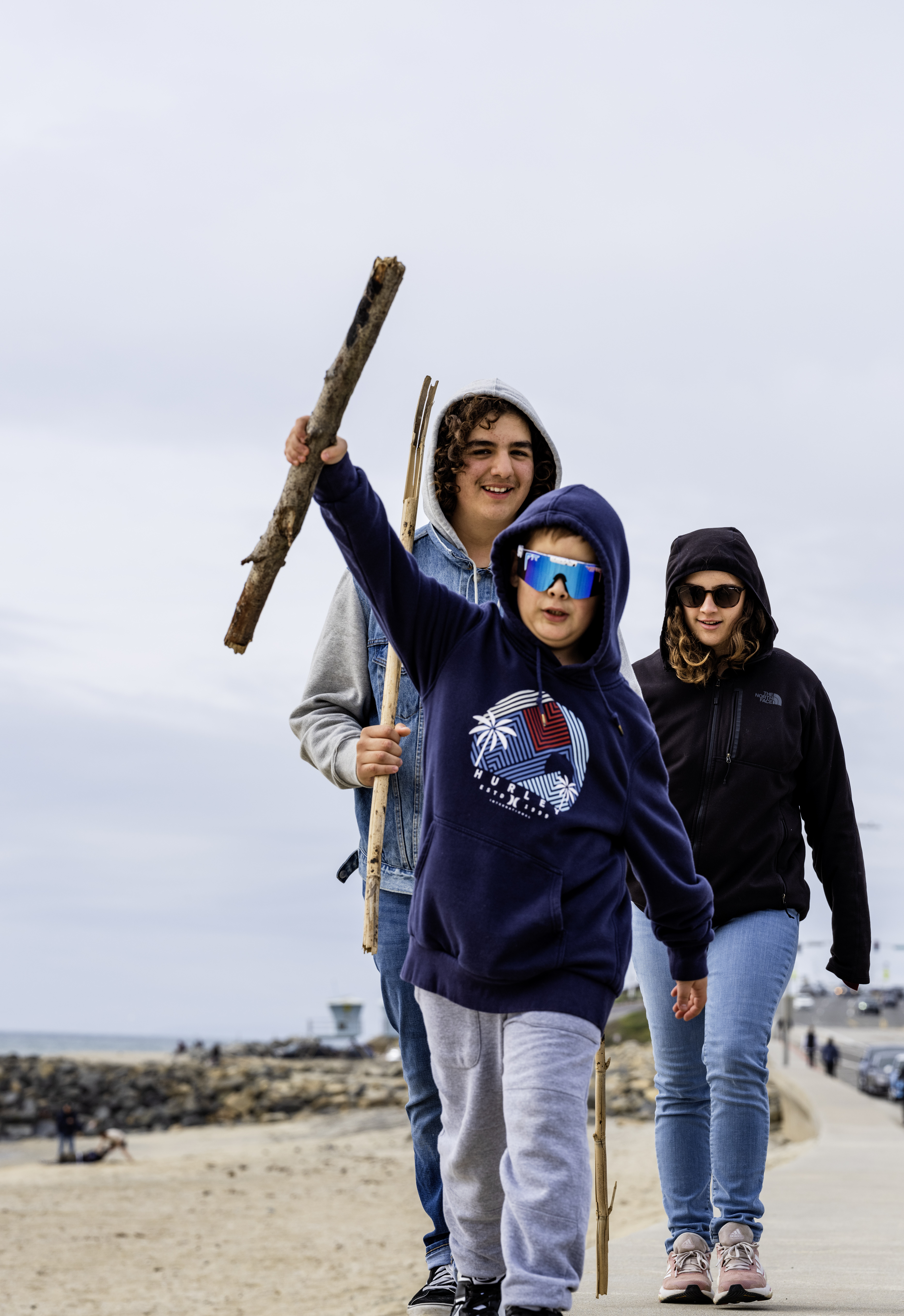 I had been photographing at the shoreline. I was leaning against a wall about chest high that separates the beach from Pacific Highway. These three jumped on the wall and came walking toward me. They were inches away when warrior kid raised his weapon and they passed by, giggling. Everything's a game at that age.
