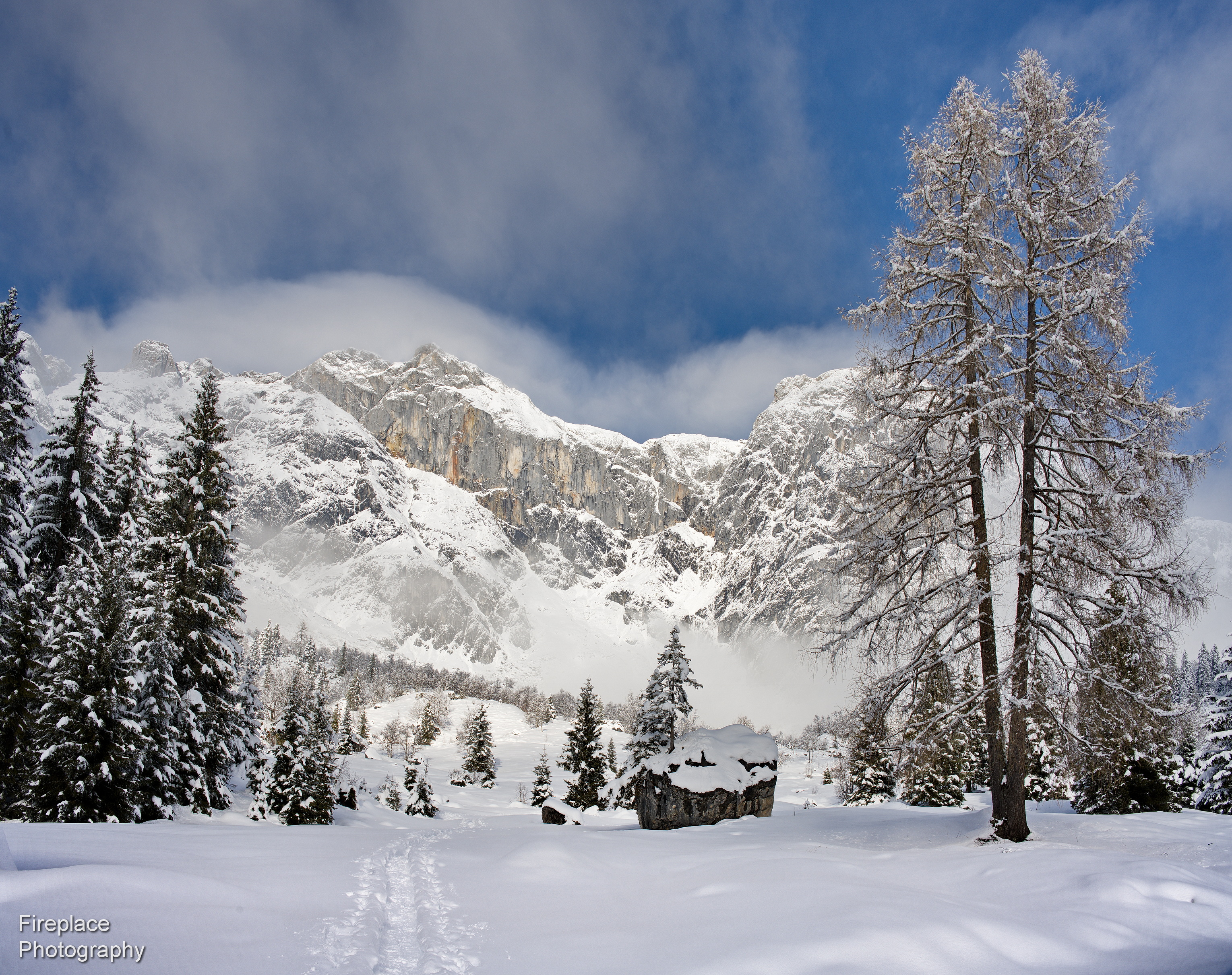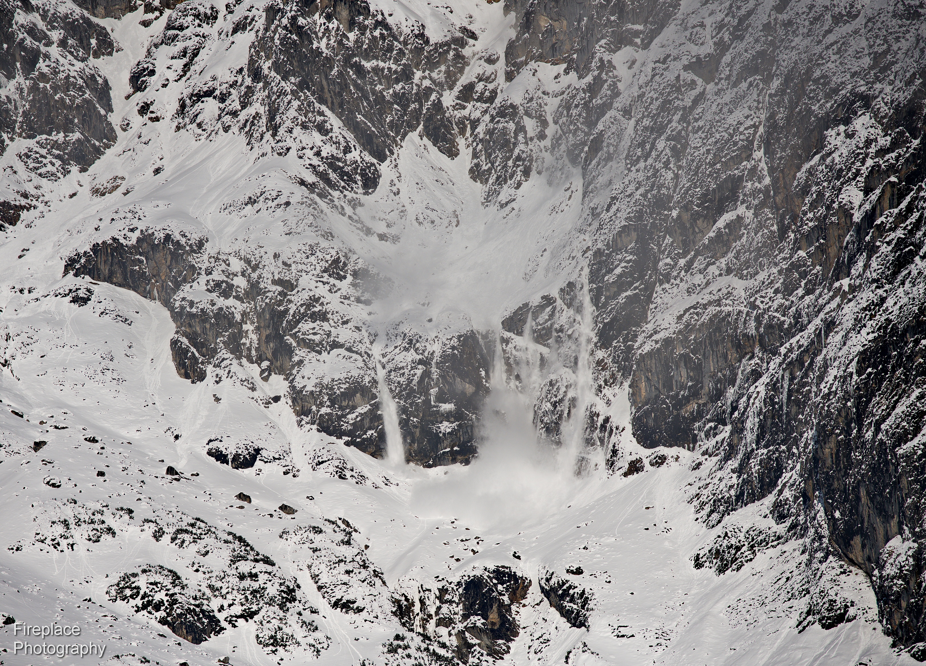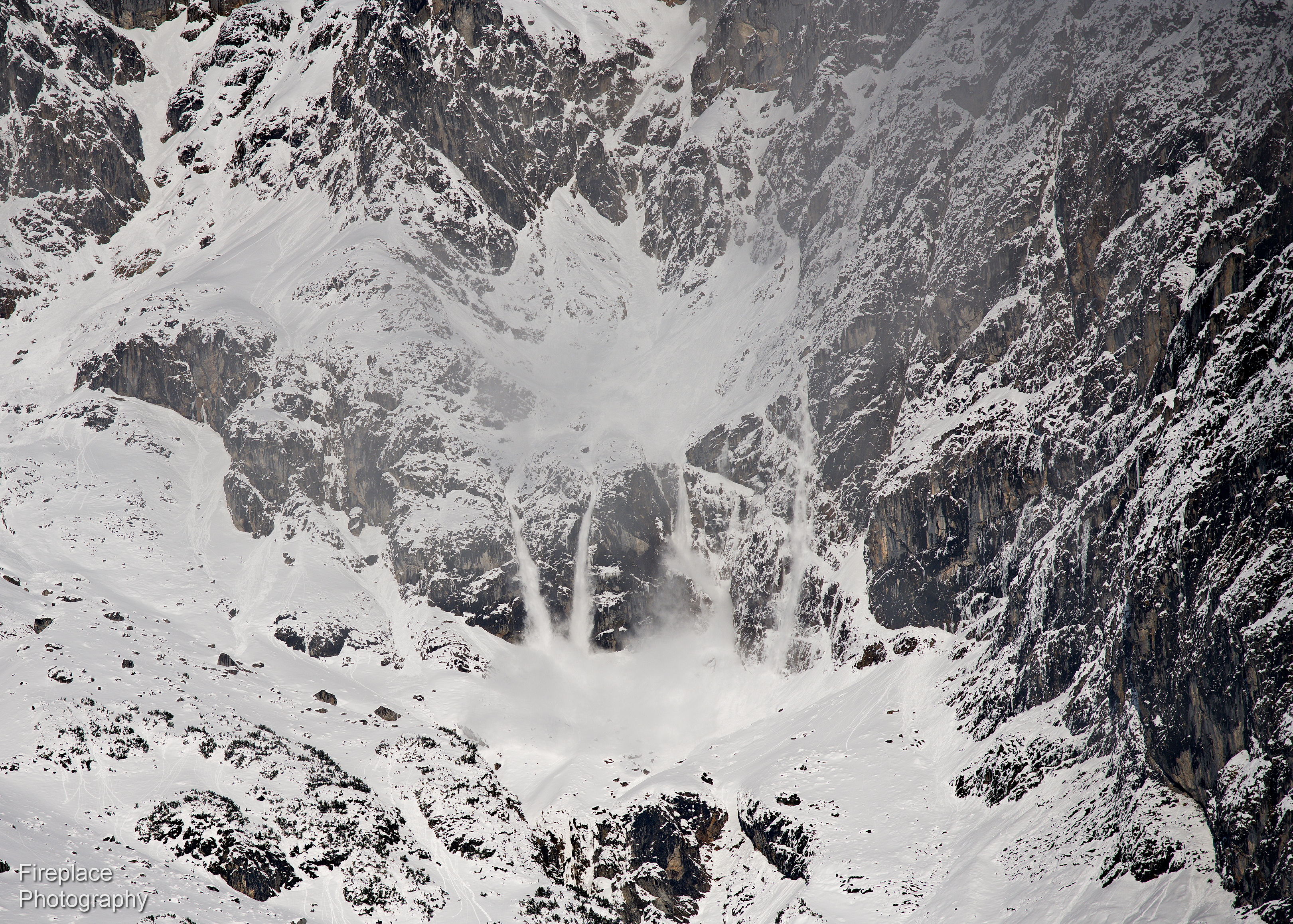 Here’s two crops, taken 9 seconds apart to show some short lived “waterfalls of falling snow” crashing down the face of the mountain from the previous shot.
