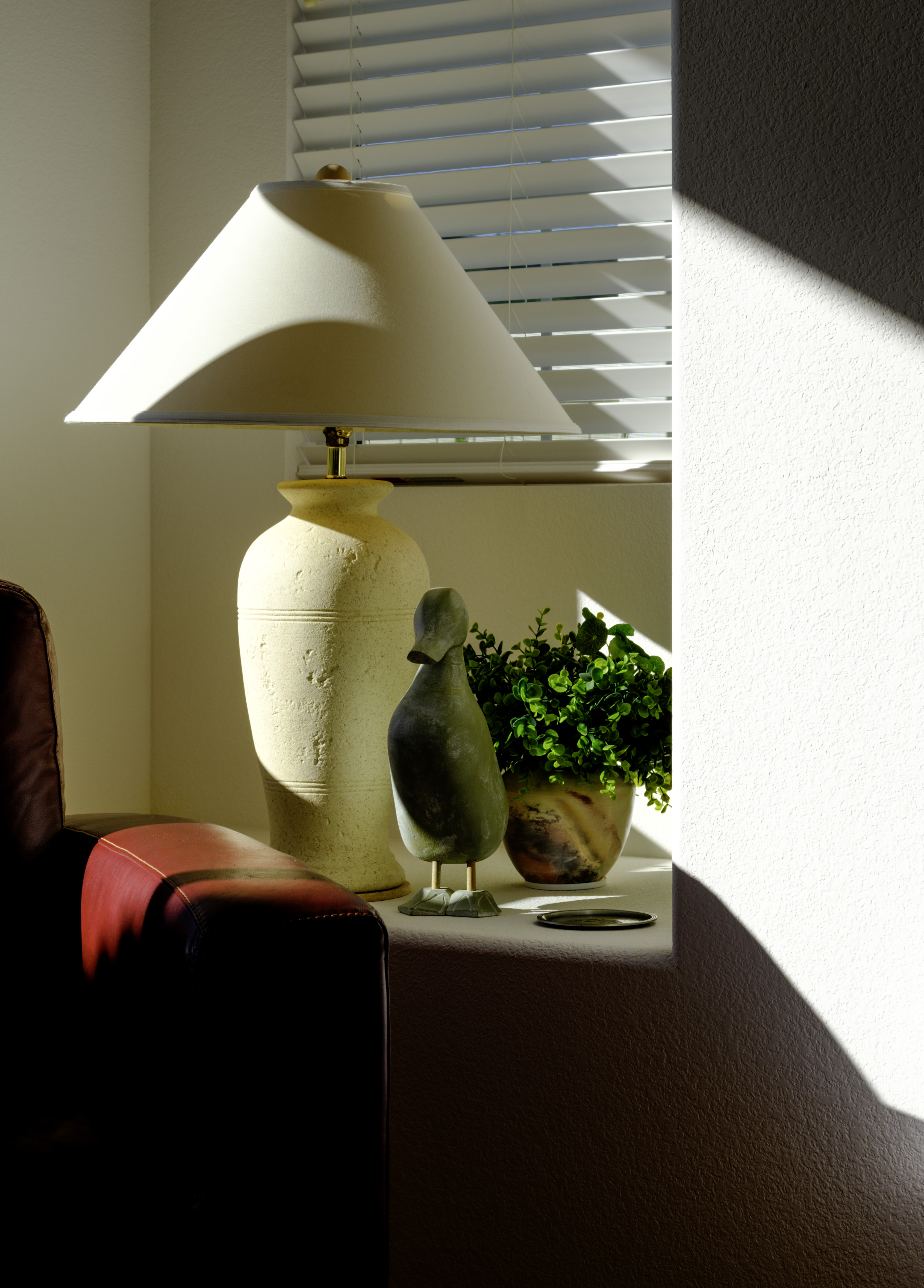 Brilliant morning sunlight was coming through the window just out of the frame to the left. The scene was actually much more contrasty than it looks here. Everything was much more in shadow and that brilliant shape on the shade was all I really "saw" and wanted to capture. The rest of the scene "wasn't there" to my eye.