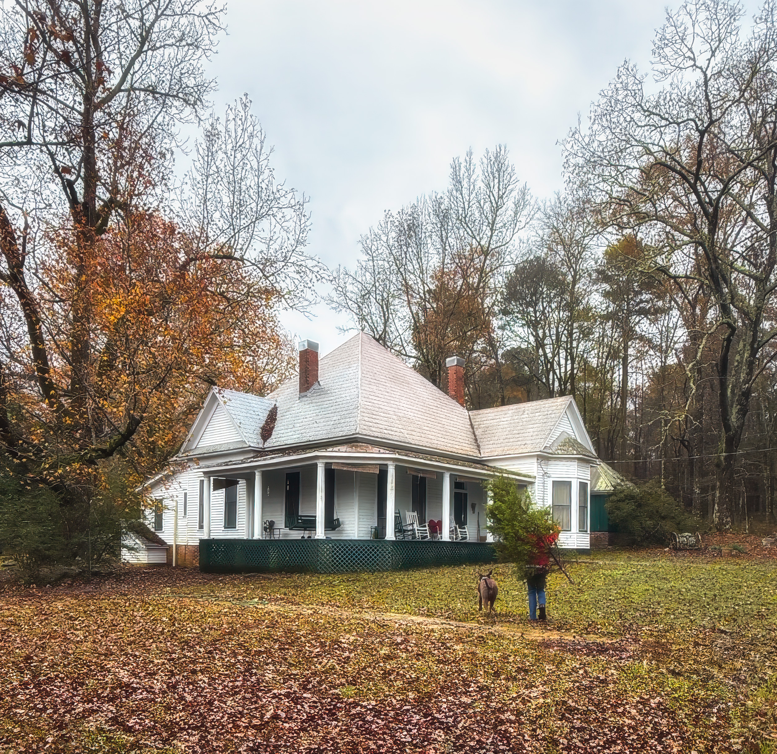 This image is long on emotion and short on technical merit. After my husband developed some medical issues, I drafted my grandson, just turned 13, to help me get a tree. We went out Sunday in the rain, chopped down this raggedy little cedar, and Jack hauled it home over his shoulder, with Zeke romping at his heels. I only had my phone but had to preserve the moment.