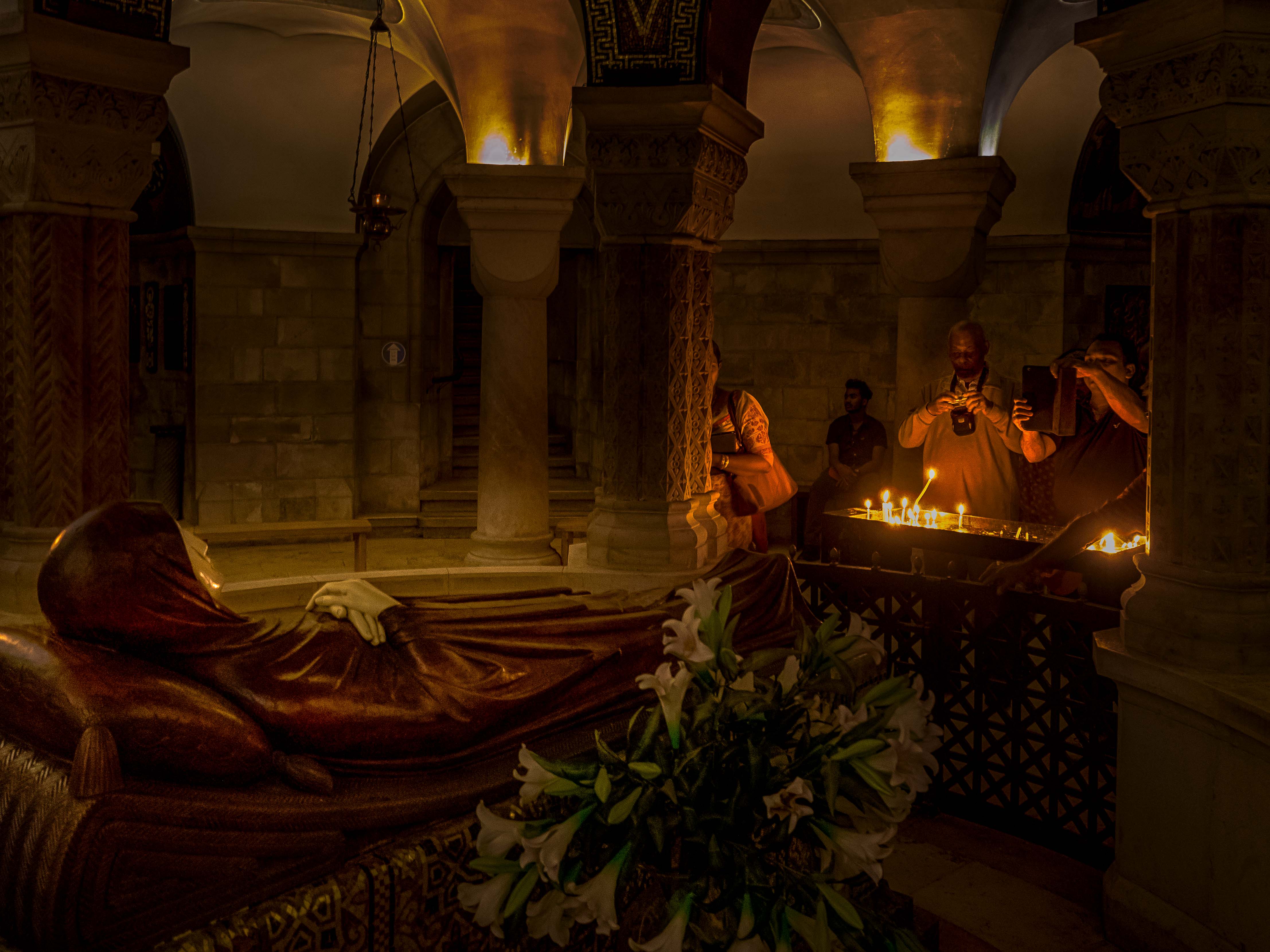 An evocative image, with that Mary-figure angled slightly away from us and the onlookers engaged in tasks we have to think about to figure out. The profusion of lilies into the foreground acts as a barrier between the figure and the onlookers, separating the venerated from the devotees. The lighting, as in Rich's submission, is a main character here. The image has the feel of a movie scene or a painting, very beautiful.