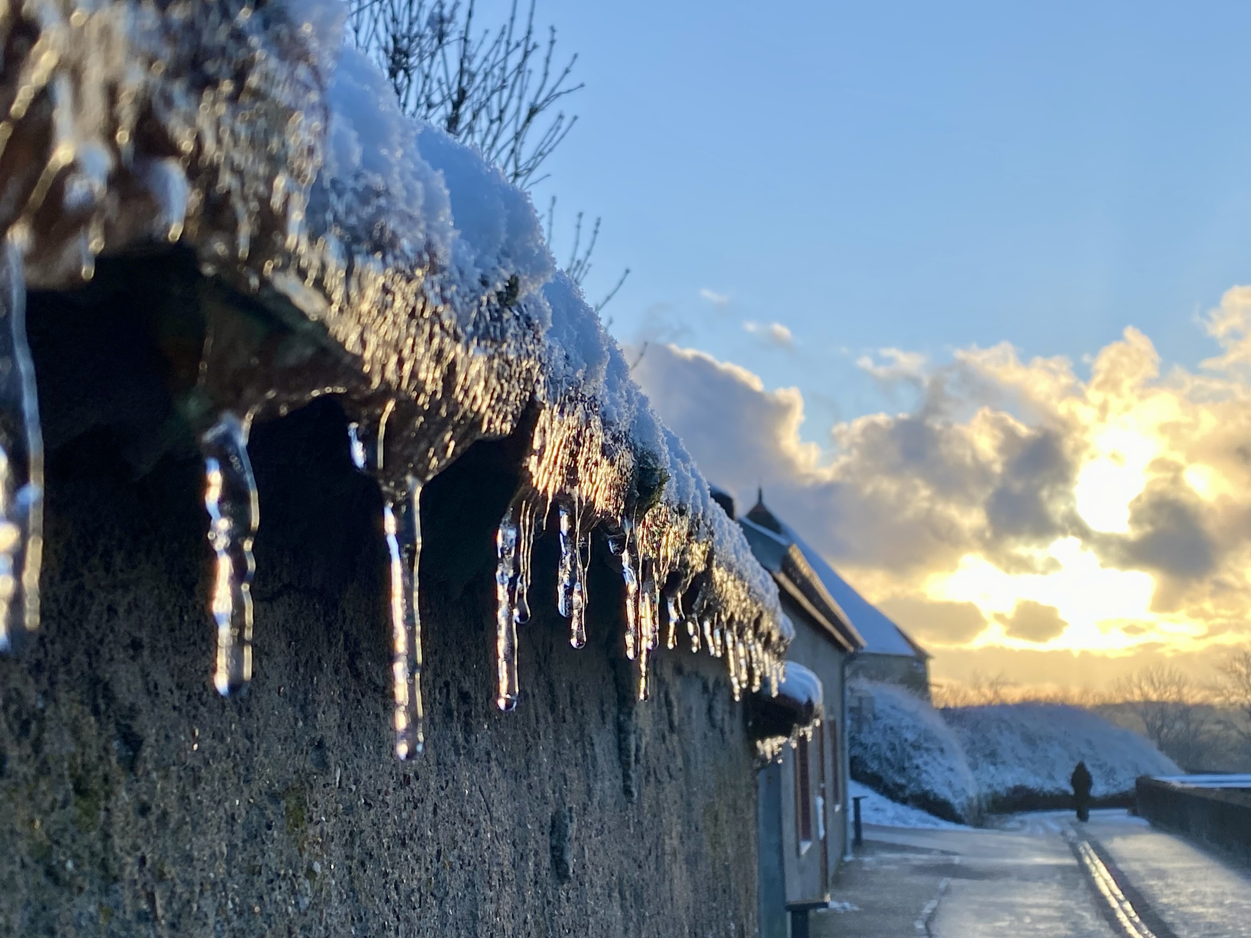 Great light reflecting in those icicles. The cold blue snow on the wall contrasts nicely with the warm sun set colours.