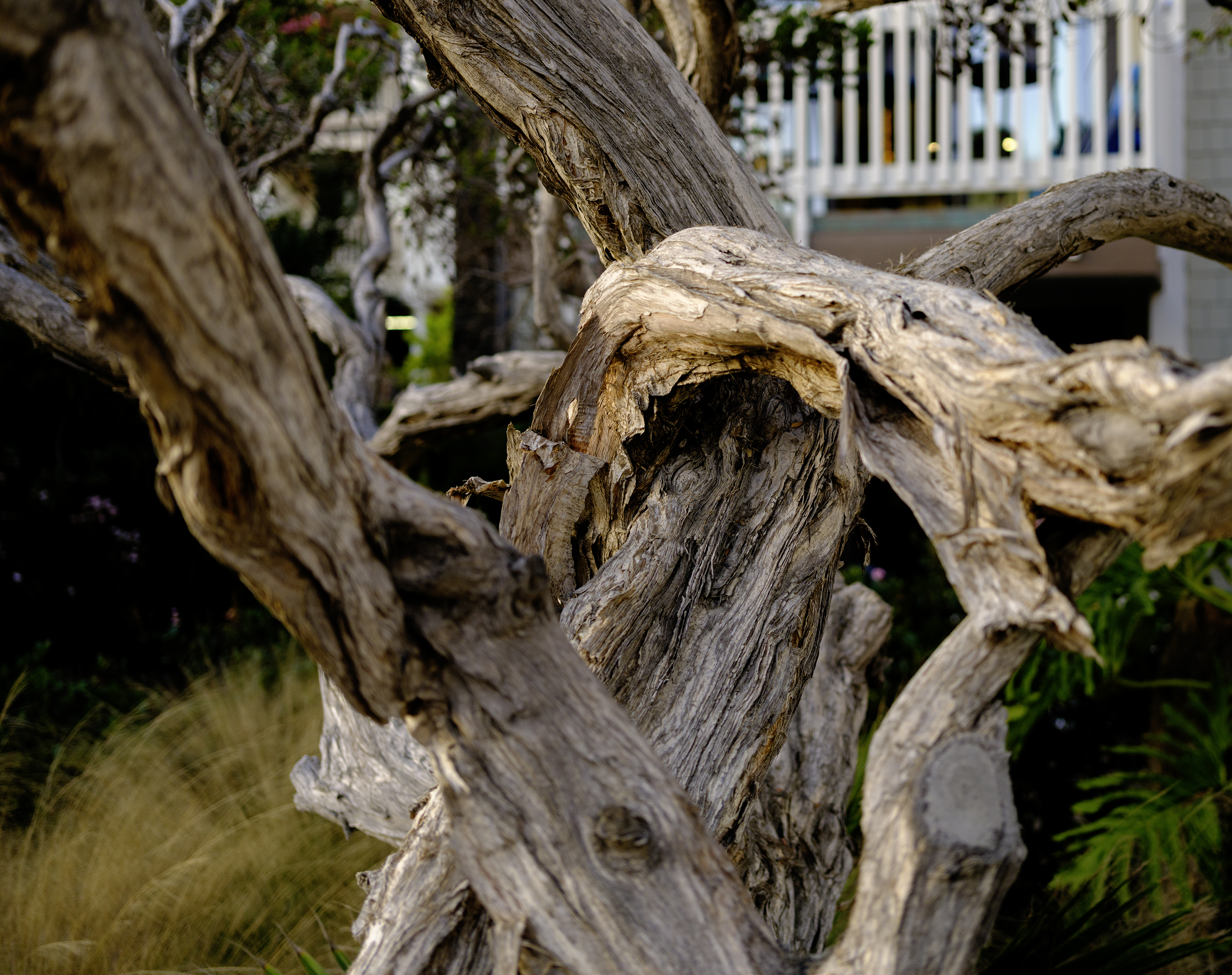 This gnarled tree, photographed in the "dead of winter," despite its looks is not at all dead. It's one of many ornamental trees on the grounds of a sea-side resort in Oceanside, CA. Actually quite attractive when seen against the greenery.