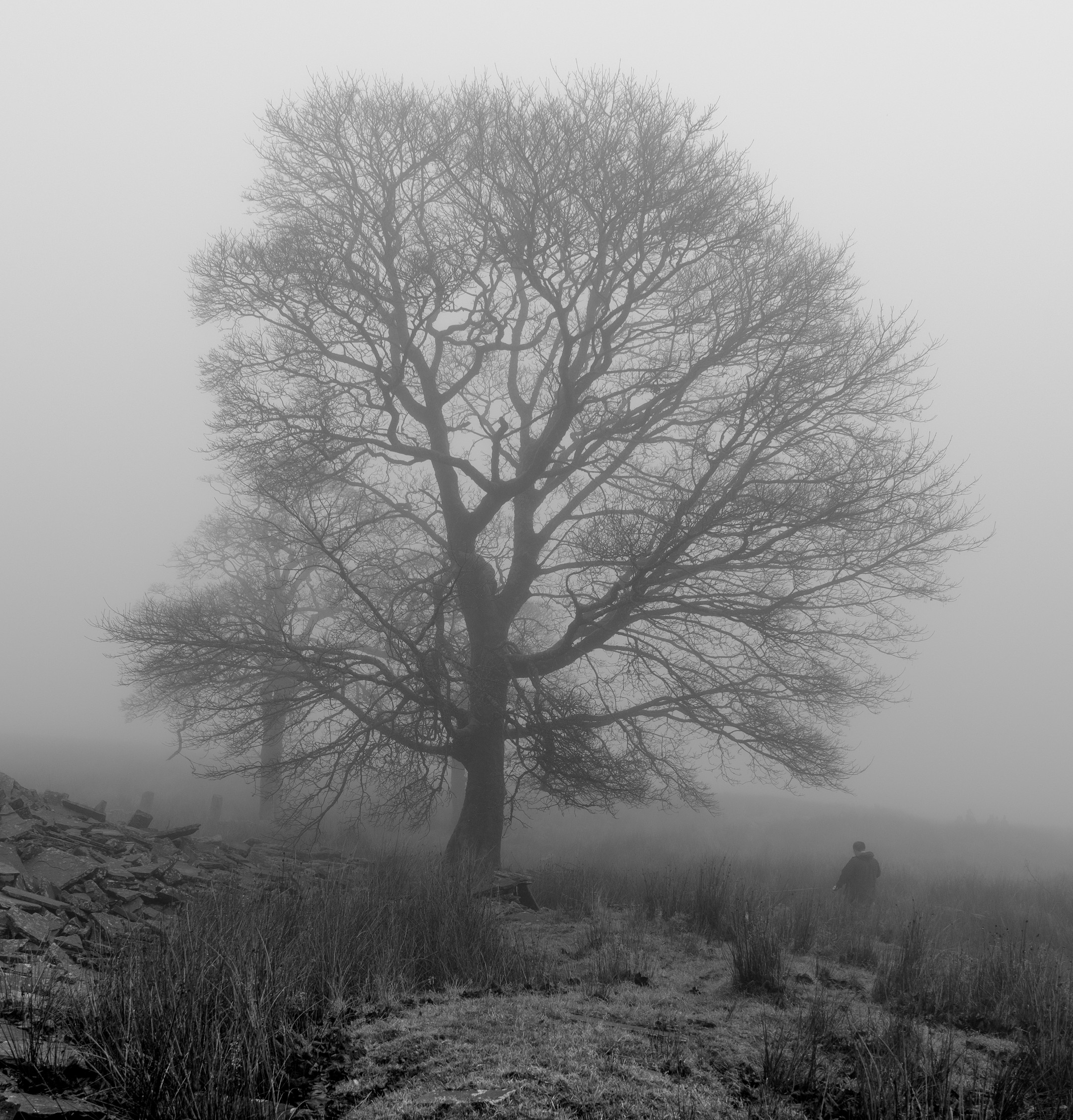 Nice Lone Tree image, made wonderfully moody by the season and the fog. A classic image of the Bleak MidWinter. The lone figure making his way to the tree, presumably to sit upon the rocks beneath it, adds to the story. A thoughtful figure sitting on the rocks would make an interesting variation, but would lack the implied motion of this shot. Like Chris's offering, and like Fireplace's series, this would look very nice in monochrome, especially with an antique look.