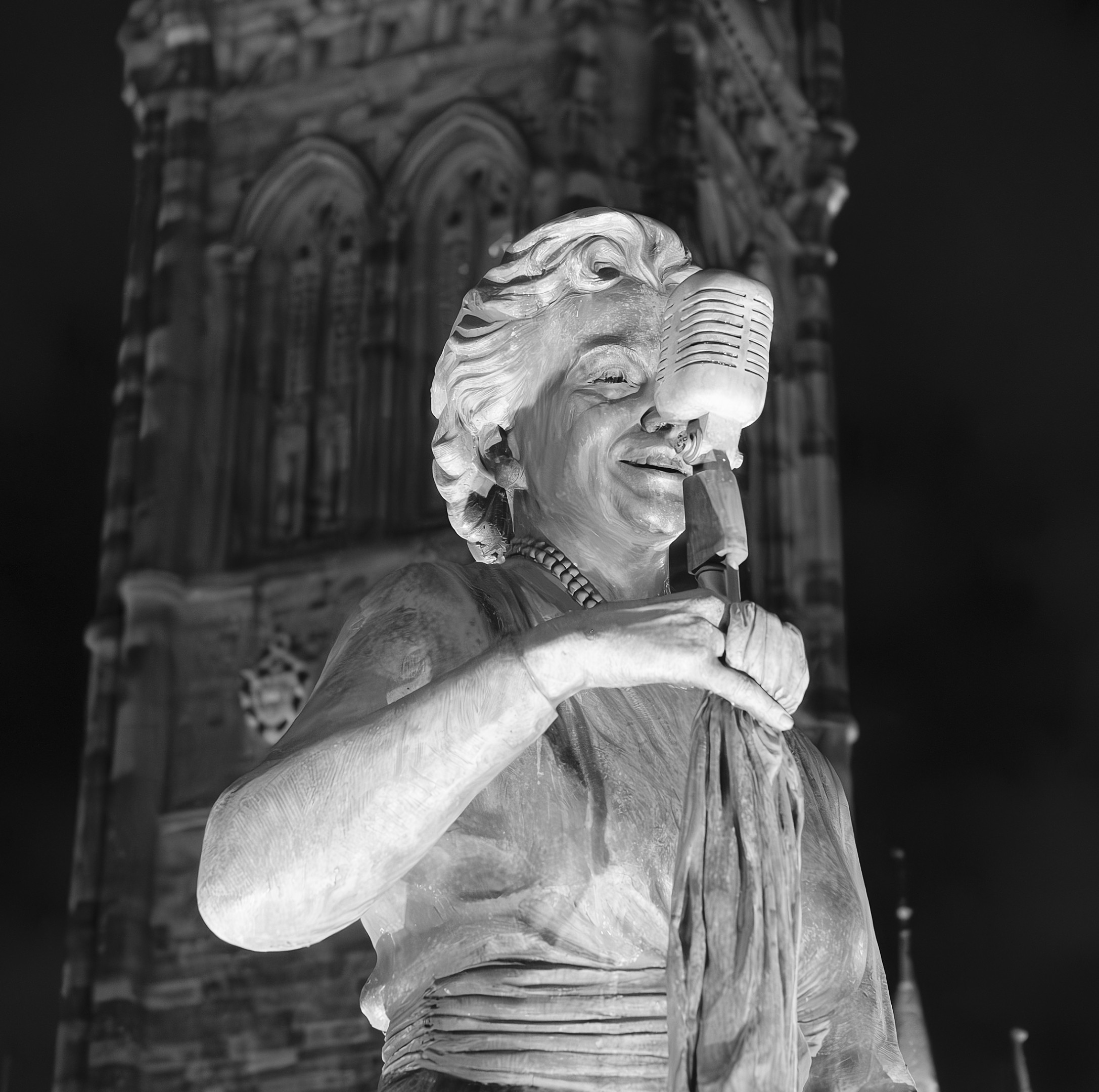 This is a statue of Gracie Fields (go on, look her up) with Rochdale town hall in the background. Taken at night, denoised and cropped. Comments invited.