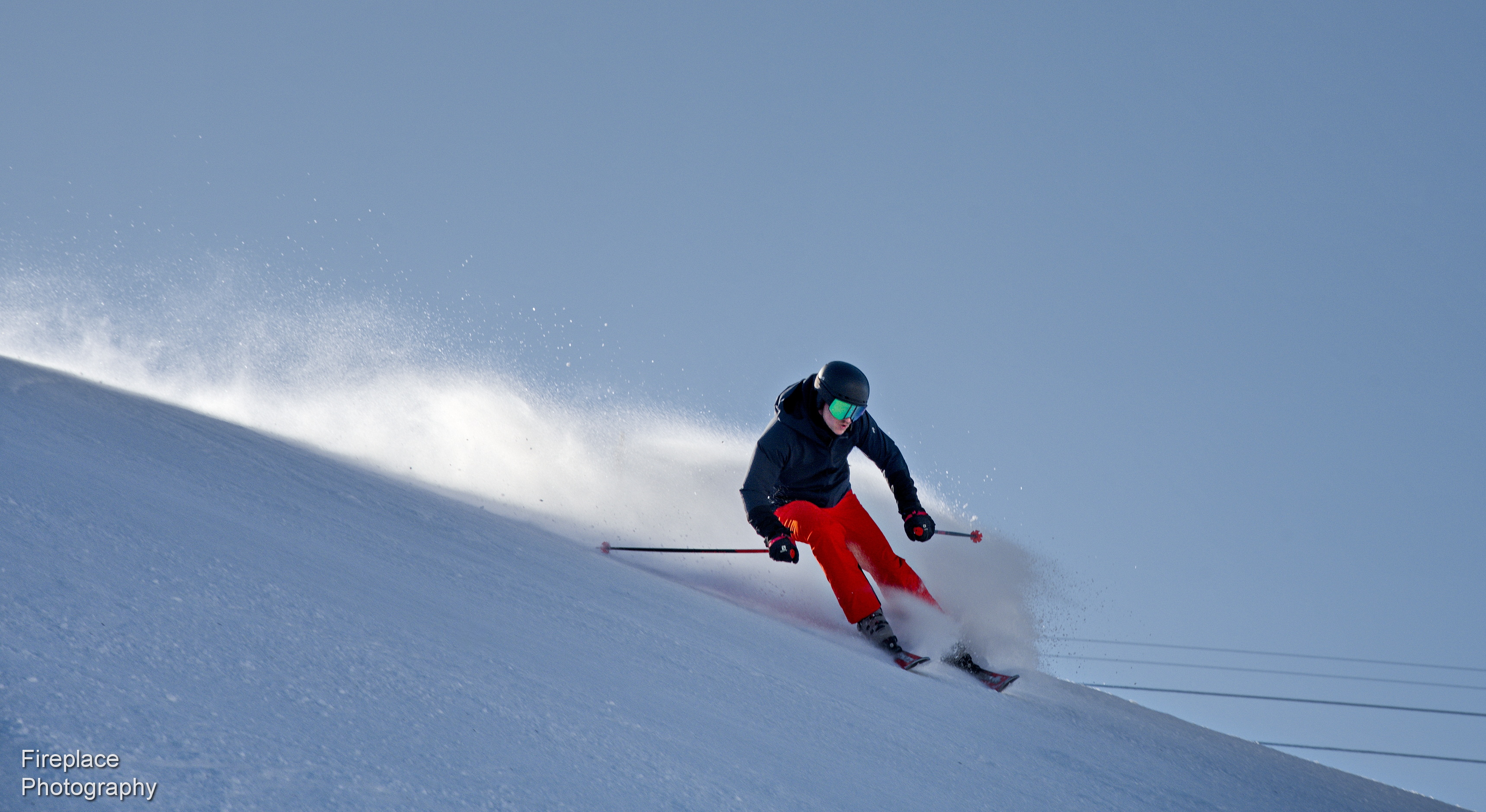 The sun is doing a great job in creating a trailing line that spells speed. Catching the skier almost front on makes a feature of the edging being used to cut into the slope. The flurry of snow thrown up between the skis is especially effective in showing speed.