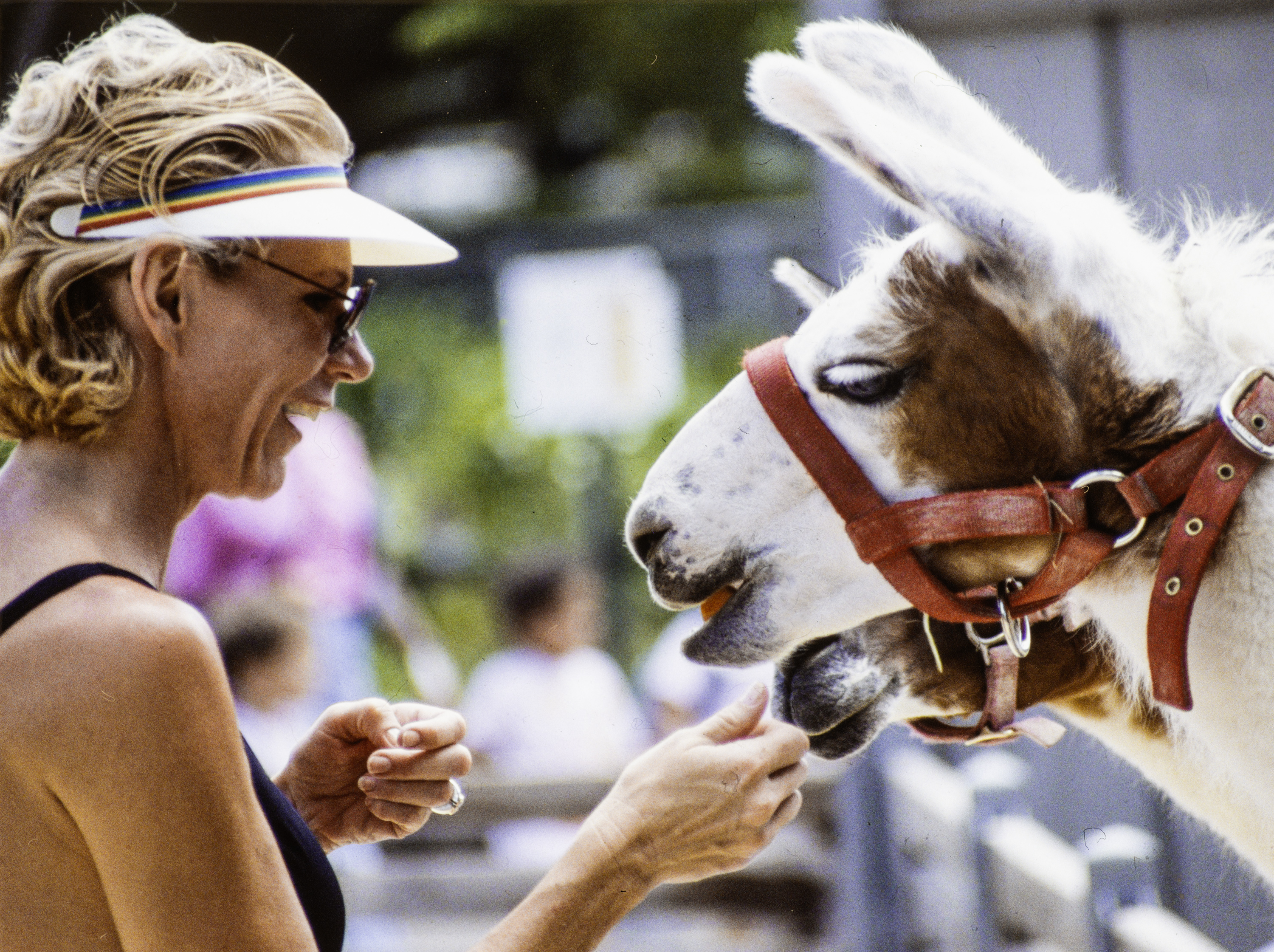 Gayle yukking it up with llamas at the Maui petting zoo.