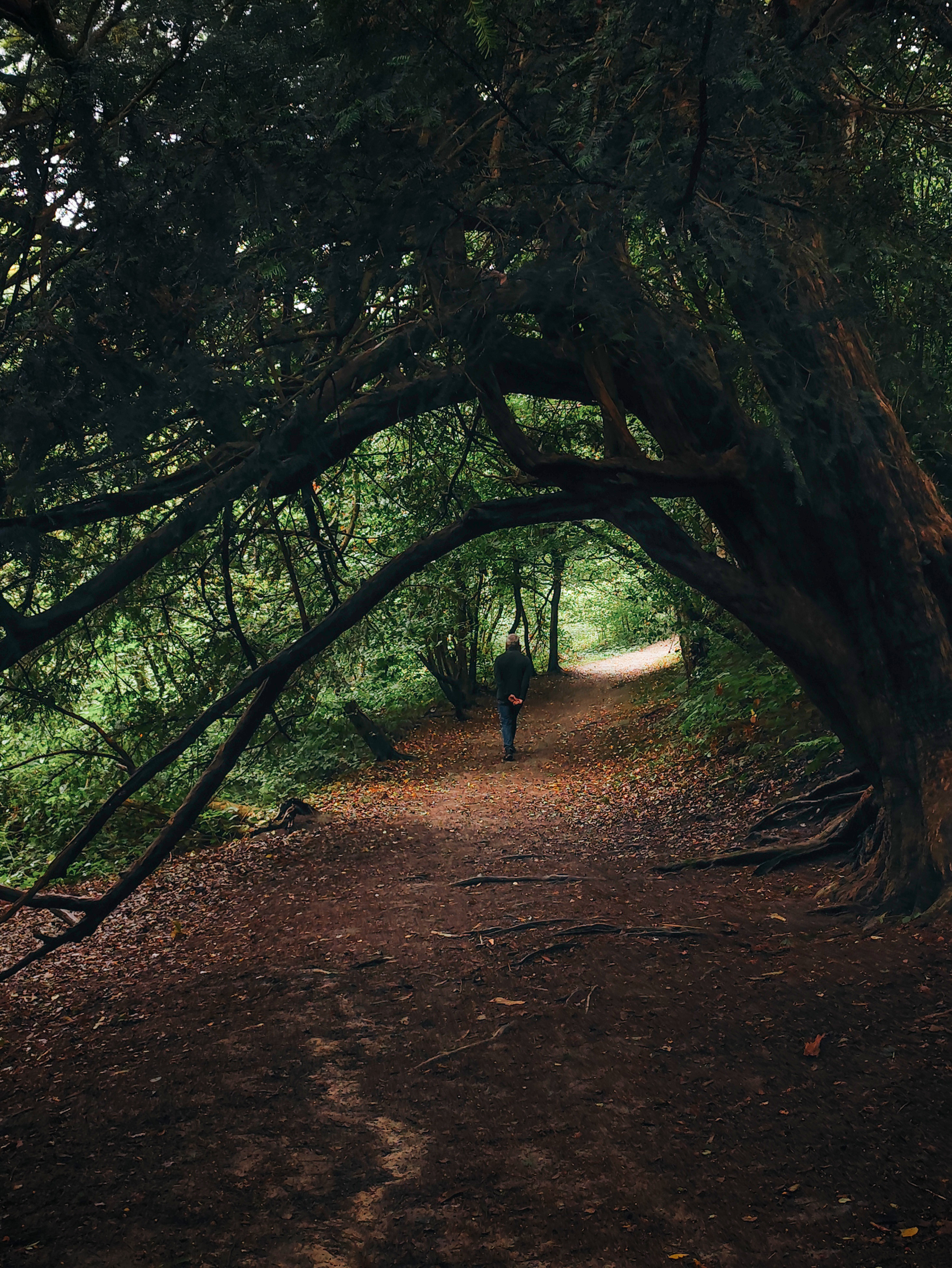 You have a good eye. The figure is within a tree-created tunnel. He has moved past one puddle of light and is headed to the bright opening within that circular form of the weathered limbs. I have a less picturesque tunnel at the back of my property in the country and I am forever using it as a photo op. Yours is much nicer!