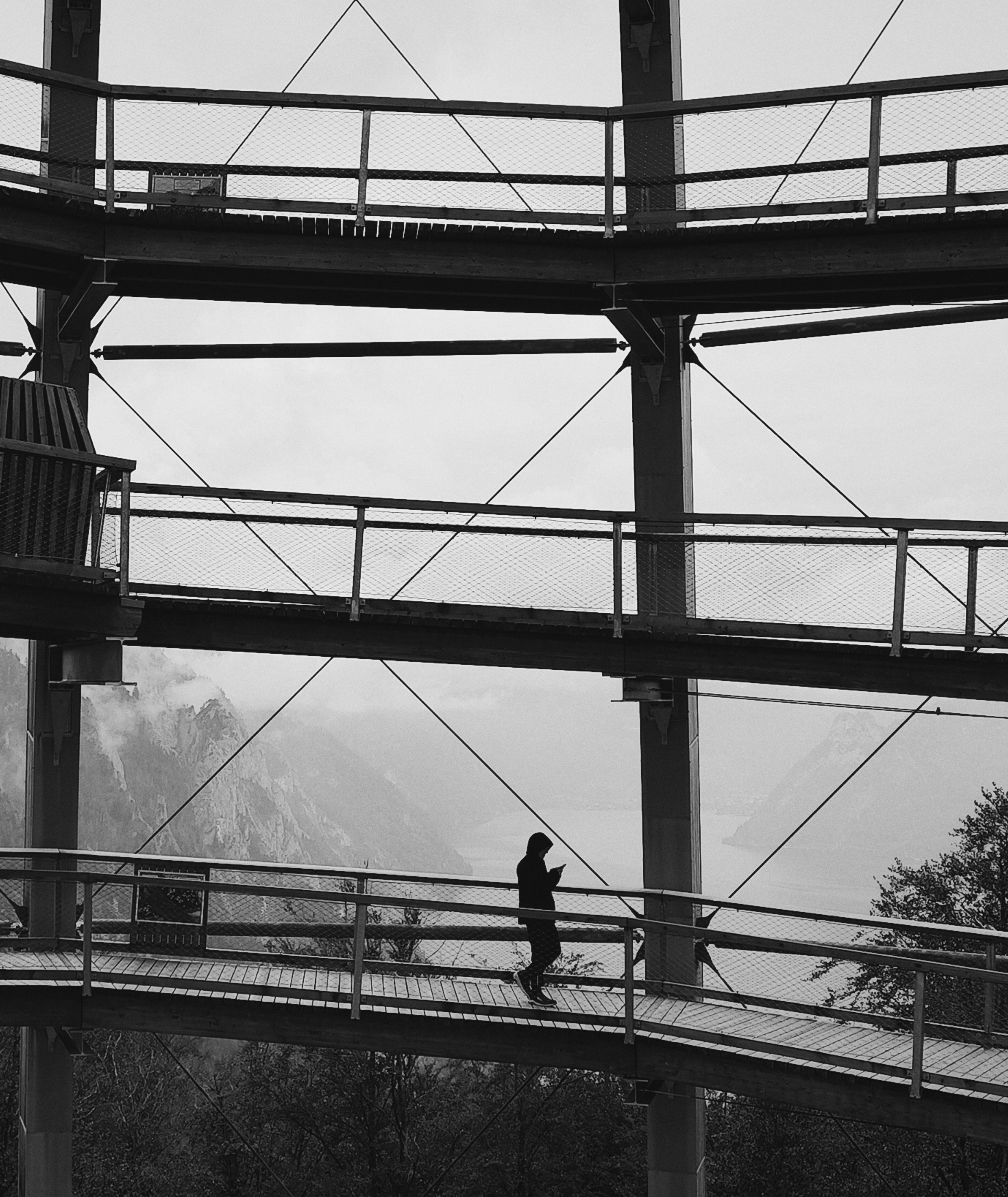 What the text is describing whets the appetite for the photo but the photo itself doesn't convey this to me. I feel there is too much in the image and not enough of it is the view. Perhaps try taking off the entire upper walkway immediately above the metal structure on the middle walkway and a little below the lower walkway. You'd keep enough walkways to make the point about them and the view would become more apparent in the shot.