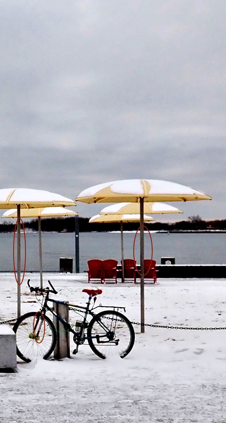 The east/west line of optimistically warm toned brollies, each with its cap of snow is a visual witty pleasure.