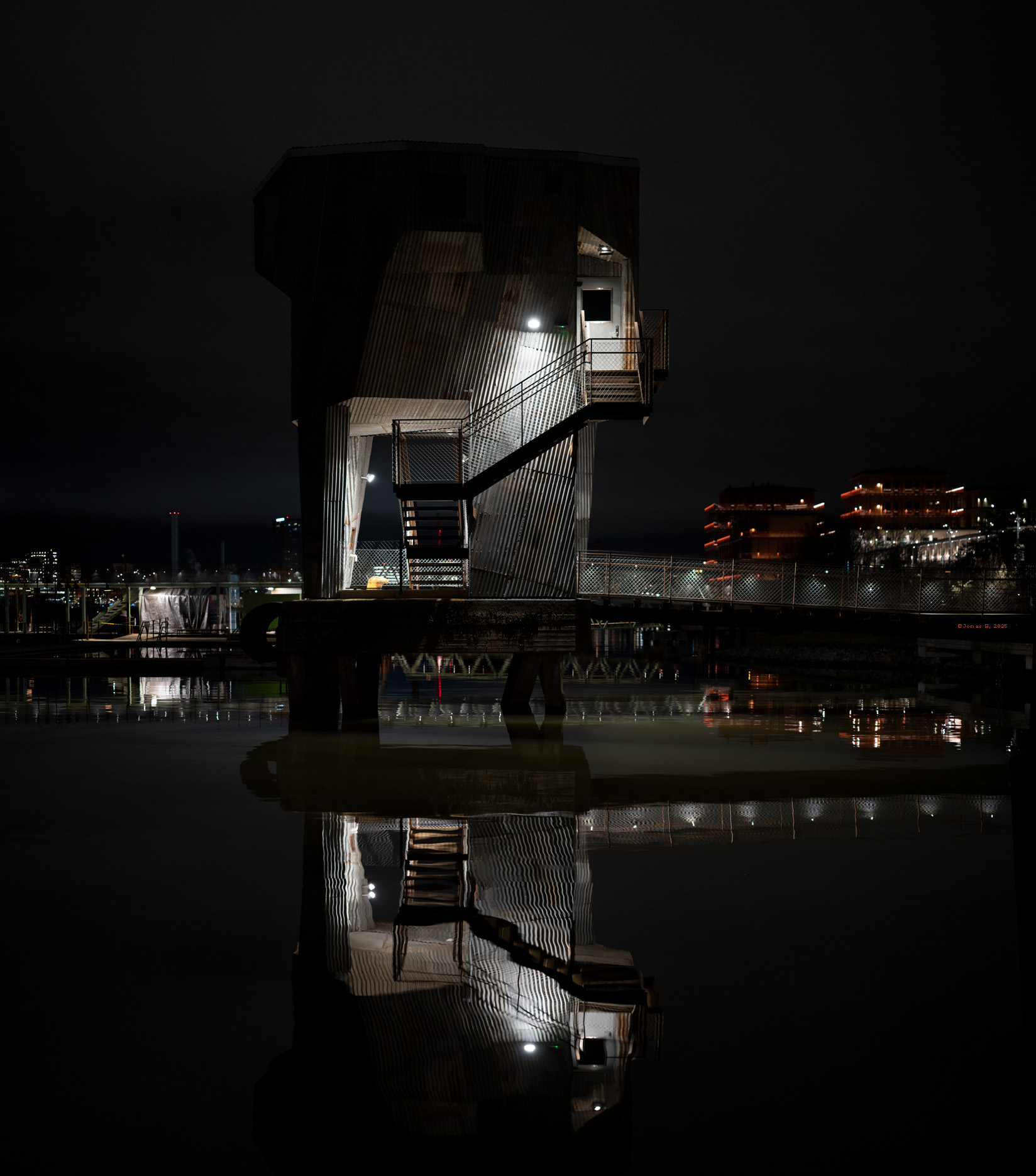 I am relieved to see that it is a building constructed to be as it is for decorative purposes, because it would be hard to imagine a functionality for that peculiar lurching style of the corrugated metal walls. Photographing it in darkness as you did lends additional interest because it leaves more mystery to it. At first glance I interpreted it as an industrial building on waterfront, which really made me wonder. The geometry and the reflection contribute to a fine composition.