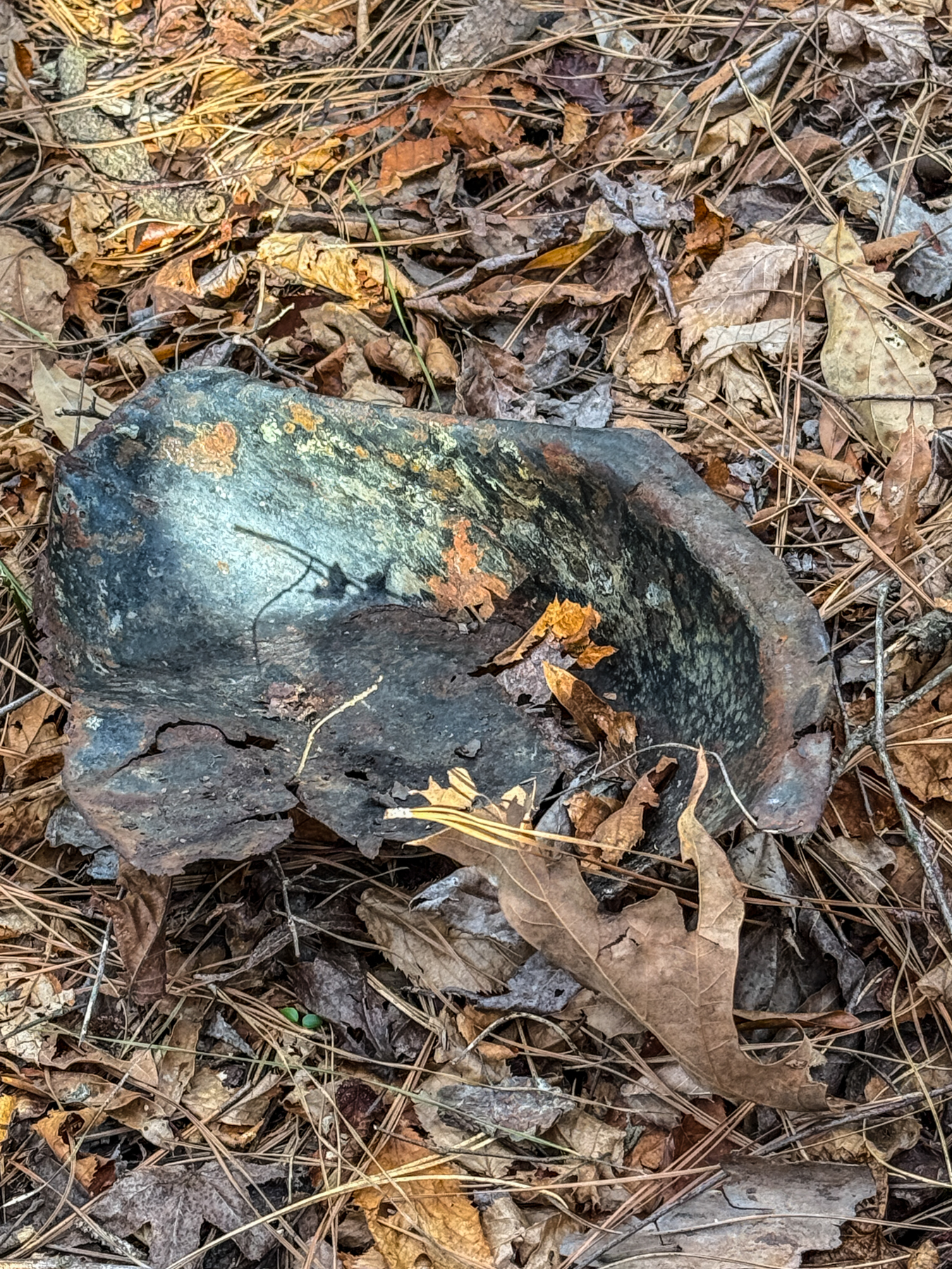 Then I came upon an area that gave me a start. On the tallest ridge, a flat area with what looked like an old roadbed laid in a circle. There were various artifacts there, an old stovepipe, old bricks, a pipe sticking up from the ground (similar to what is used for artesian spring wells in this area), the back of an old metal chair of some kind, various worked stones (foundations? doorsteps?), rusted tin roofing material.