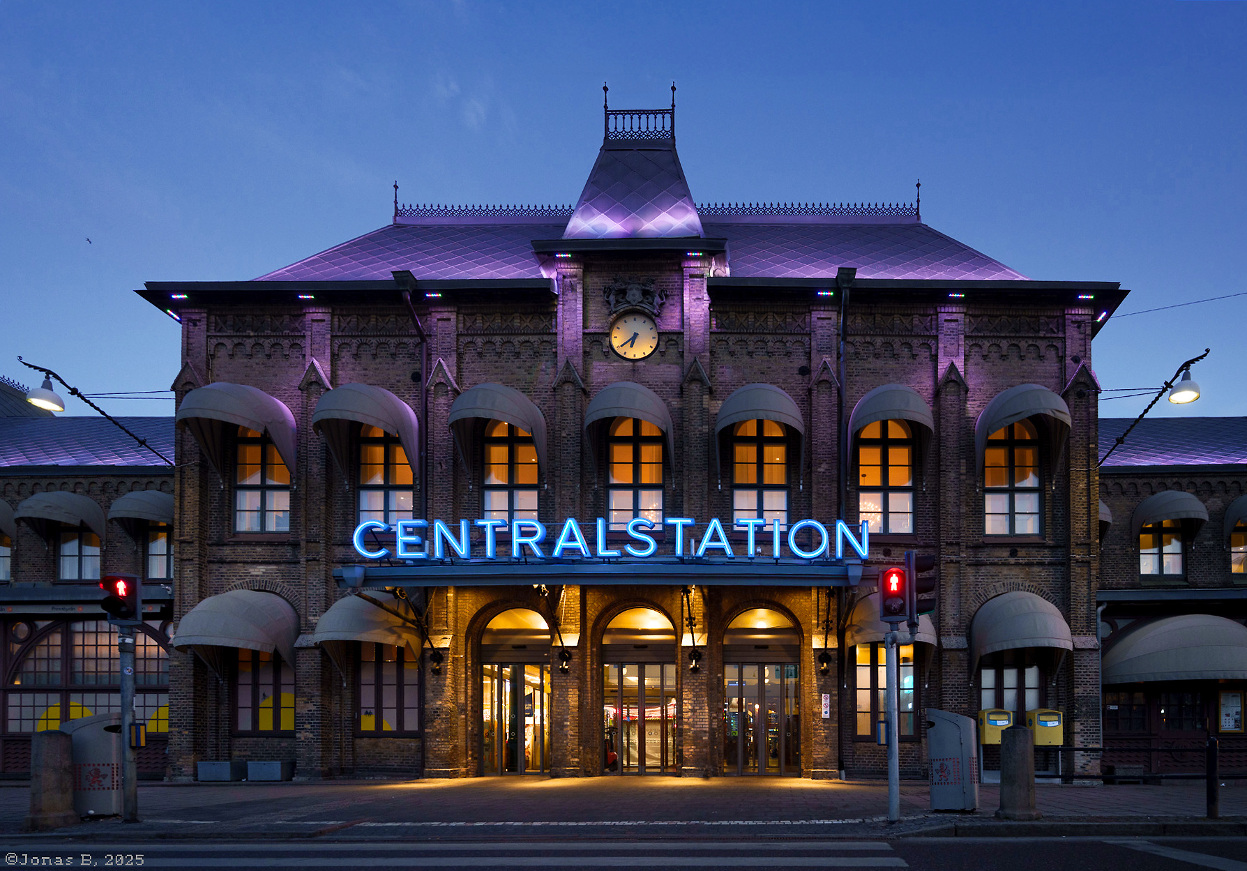 Because the image of that building, taken from that position, presents itself more as an architectural image than as a situational image trying to give us the feeling of the whole square and the "train vibe), I feel like the image could benefit also from a touch of perspective correction. Both the vertical and the horizontal axis could use a very subtle, minimal tilt (vertically: forward / horizontally : towards the right).