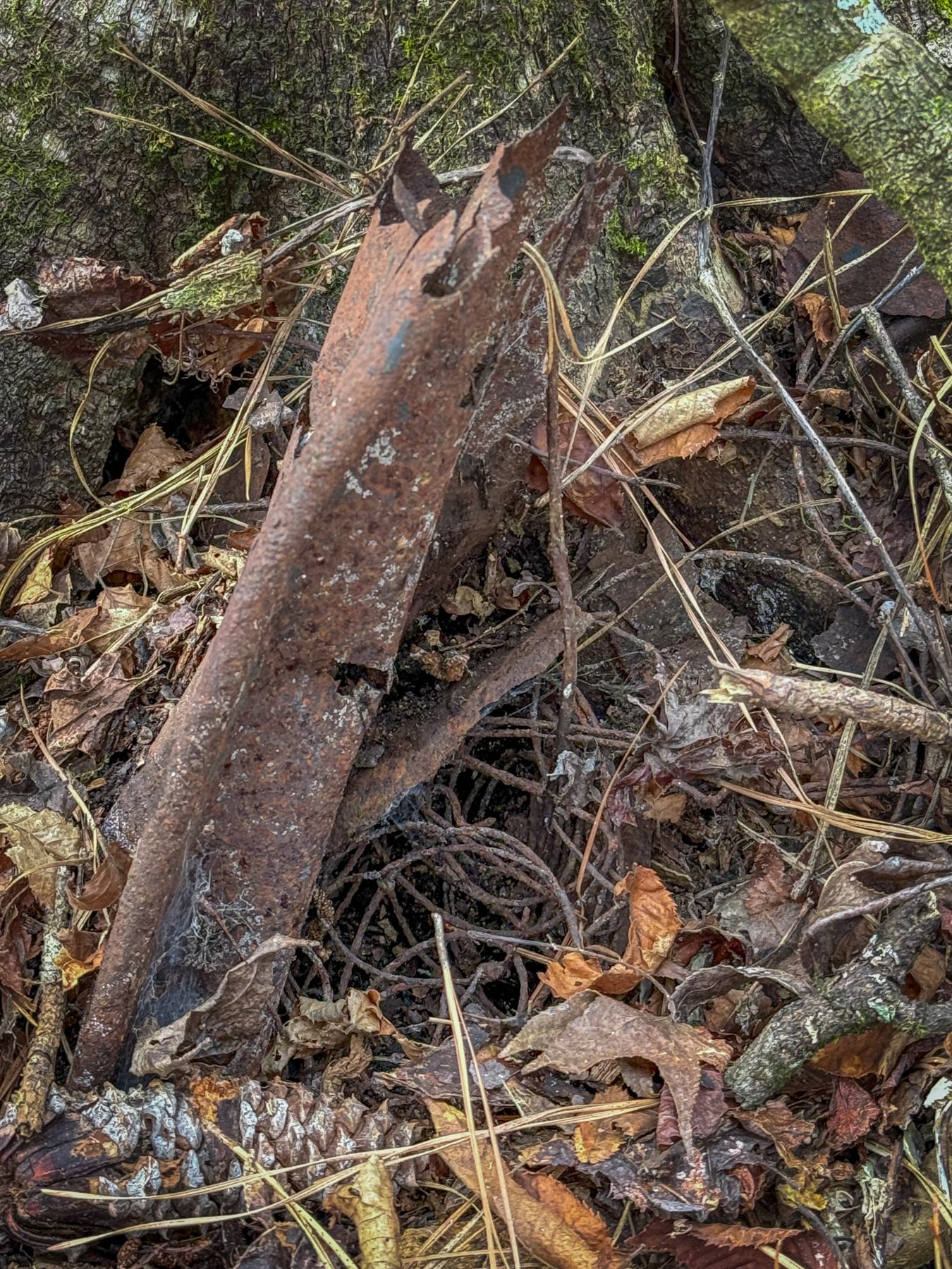 The last item I found Sunday evening was inside a tree. What looks like a bedspring and rail were embedded in the roots of this oak tree that looks to be 70 years old. So now I have to peep into the roots of the trees to find more clues.
