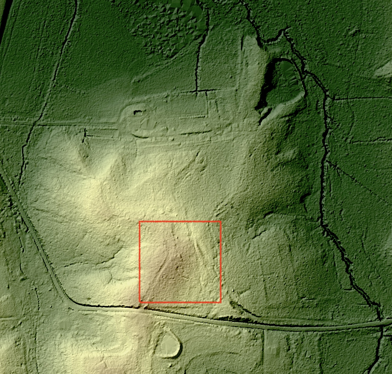 The last image is the lidar for this section. I don't know much about lidar (except that it's very subtle) but I do know it shows an old roadbed, and an oddly regular shape like an inverted "9", which doesn't look like a natural feature.