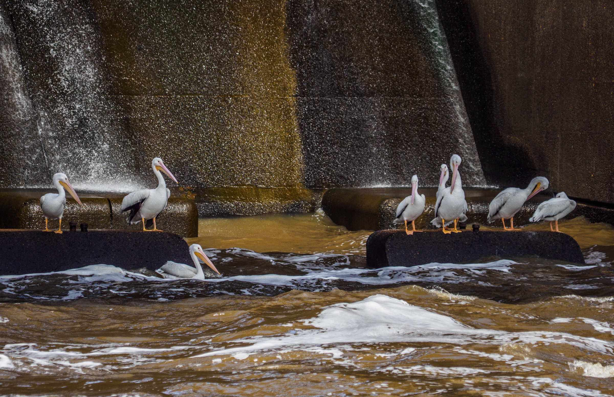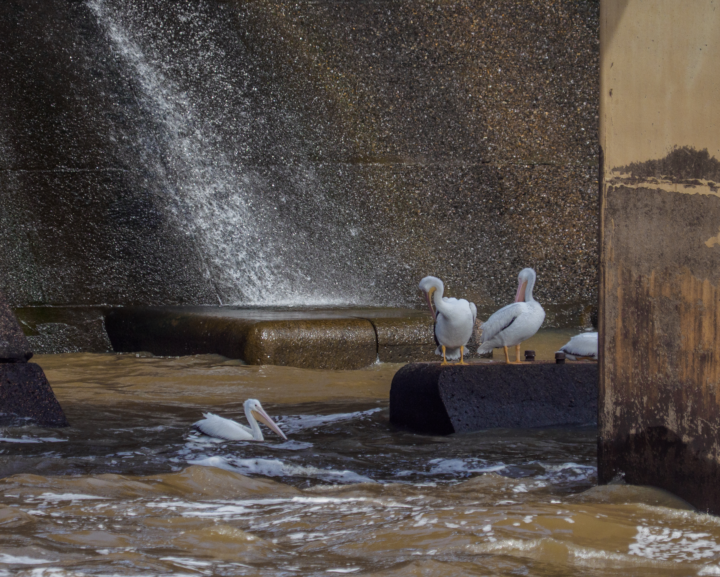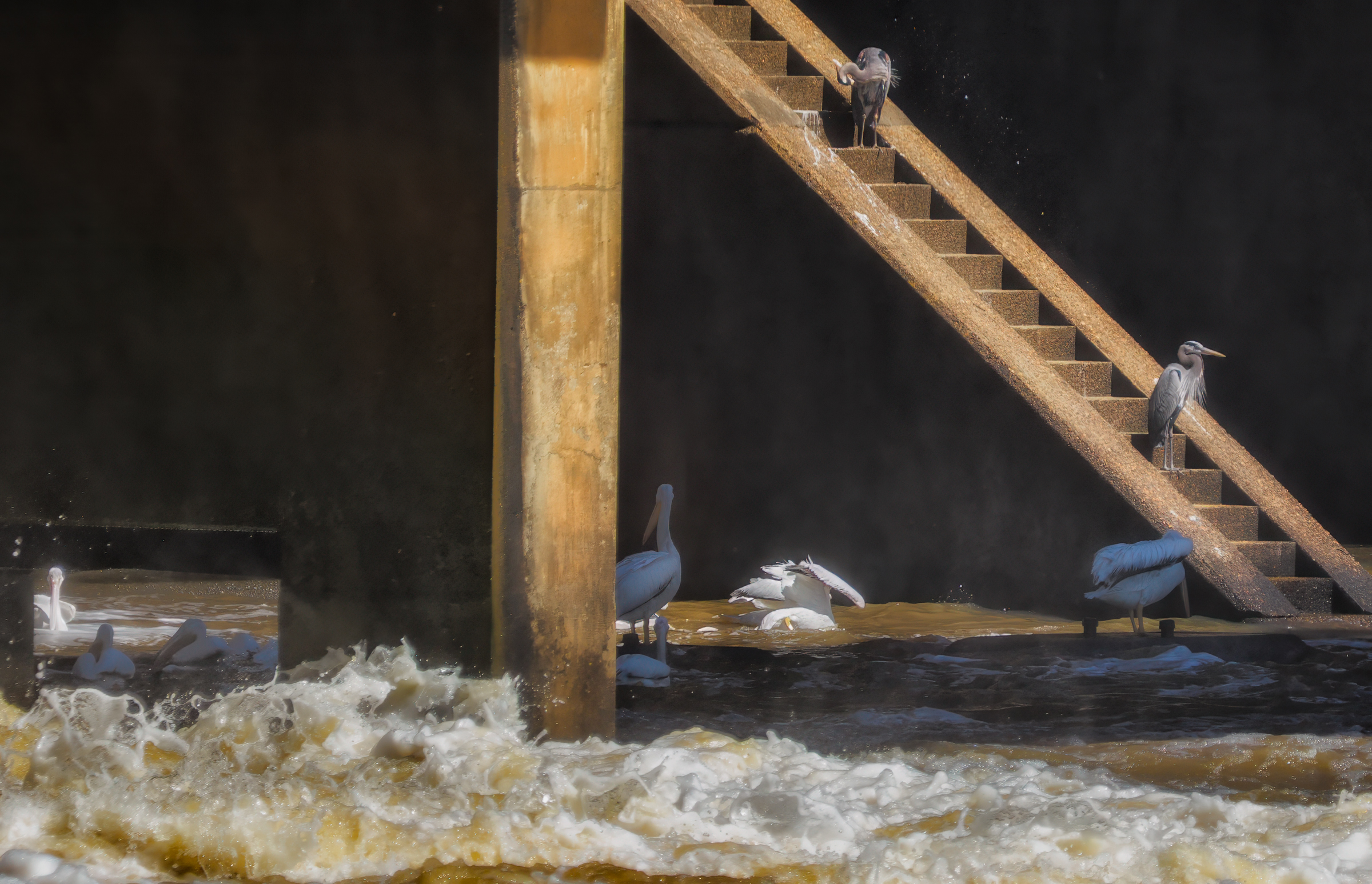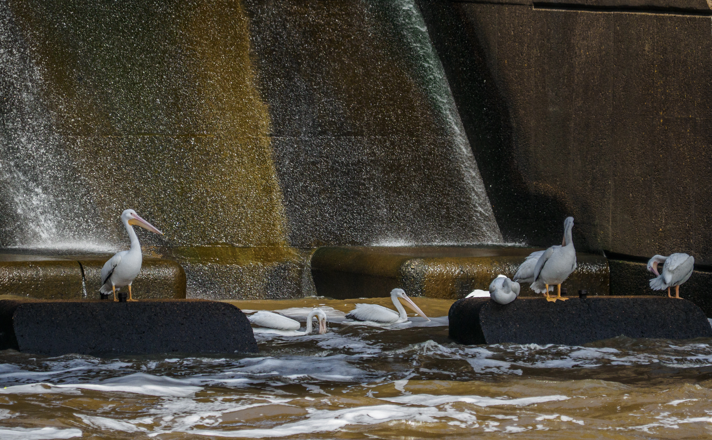 American White Pelicans have been over-wintering here for the past 10 years. They choose certain islands in the local lake to make their home, then deploy groups out from their island twice a day on fishing expeditions in the lake, and occasionally down the river. Last week, this flight group discovered the joys of the dam. No pelican group or even a lone bird has ventured into the egret and heron territory before now. They are spending their days in luxury, frolicking in the waterfalls, sunning and napping on the concrete benches, scooping up the plentiful fish in the square concrete pools where only herons and egrets have fished. They may decide never to leave.
