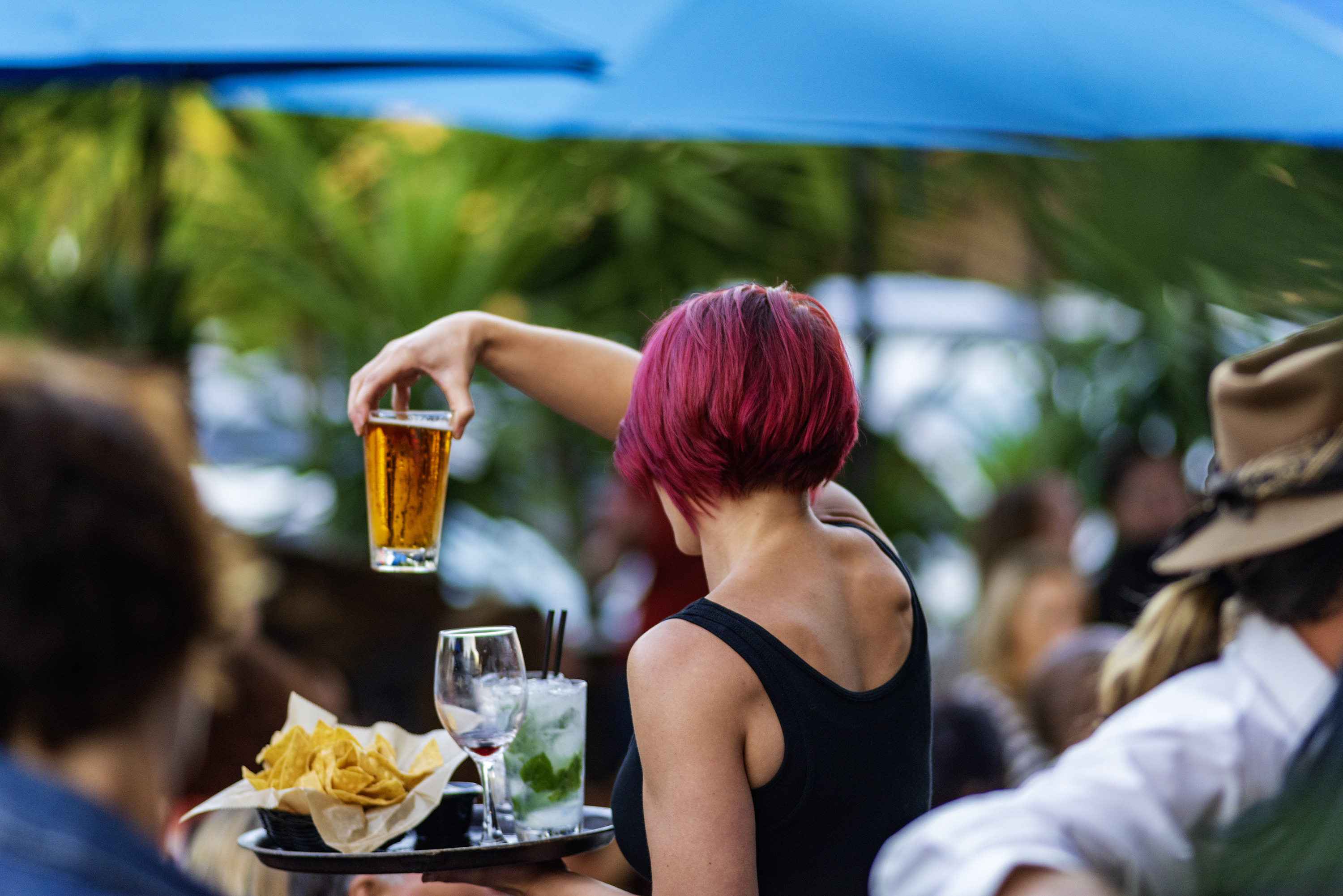One would expect this portrait of a waitress in action to be in portrait orientation, showing more of her body and the movement of her meandering through a crowd with a serving platter with food and drinks and a beer glass held like it is a sacrament.