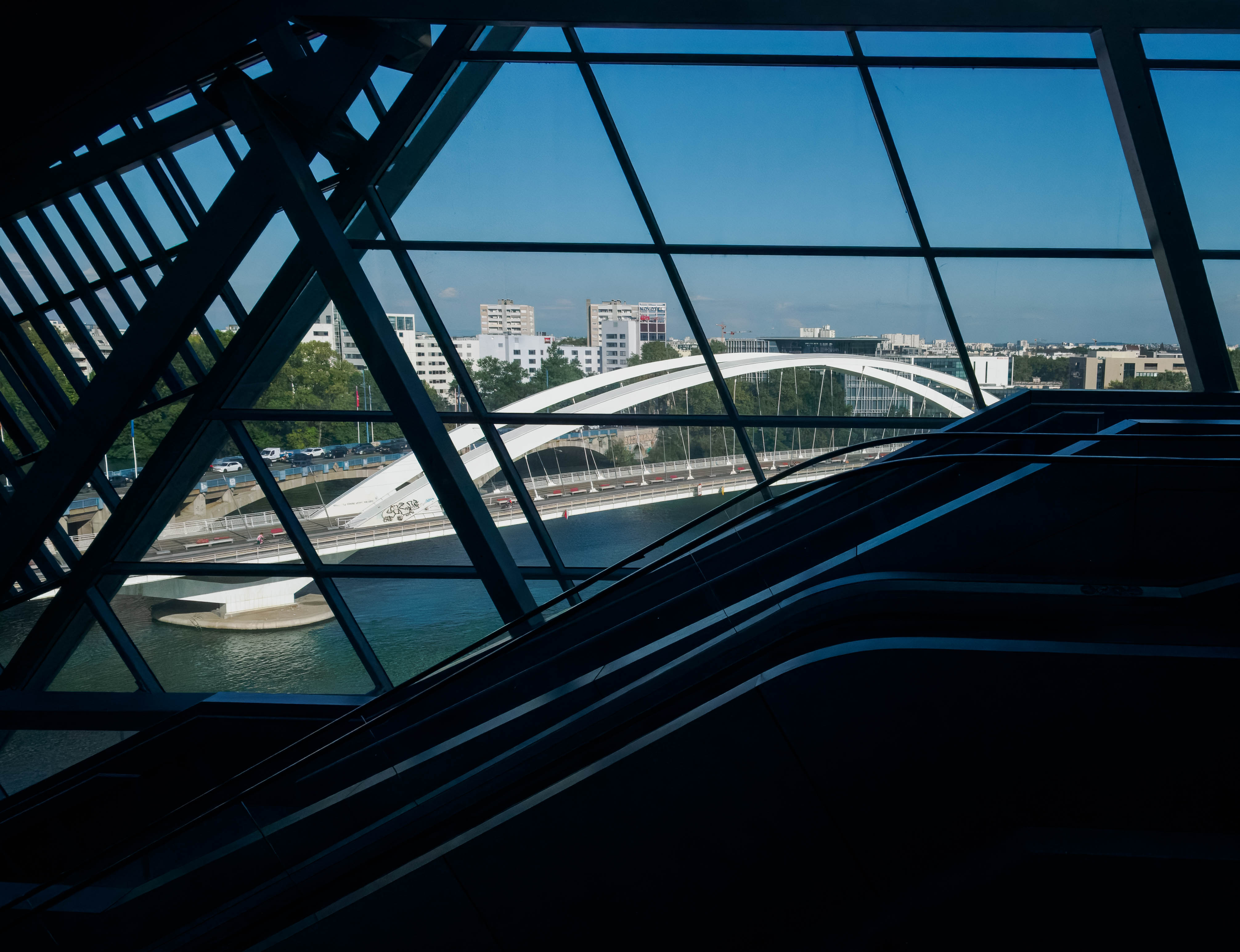 A few weeks ago, Roel posted images of the Musée des Confluences in Lyon (see here ) which is architecture from a photographer's dream. This photo is also taken there, but from the inside looking out. I was fascinated by the interplay of different lines, which are mainly straight, but including the elegant white curves of a bridge. By exposing for the outside, the interior is almost black, but the lines of the escalators, shining faintly, break up the block of darkness at the bottom.