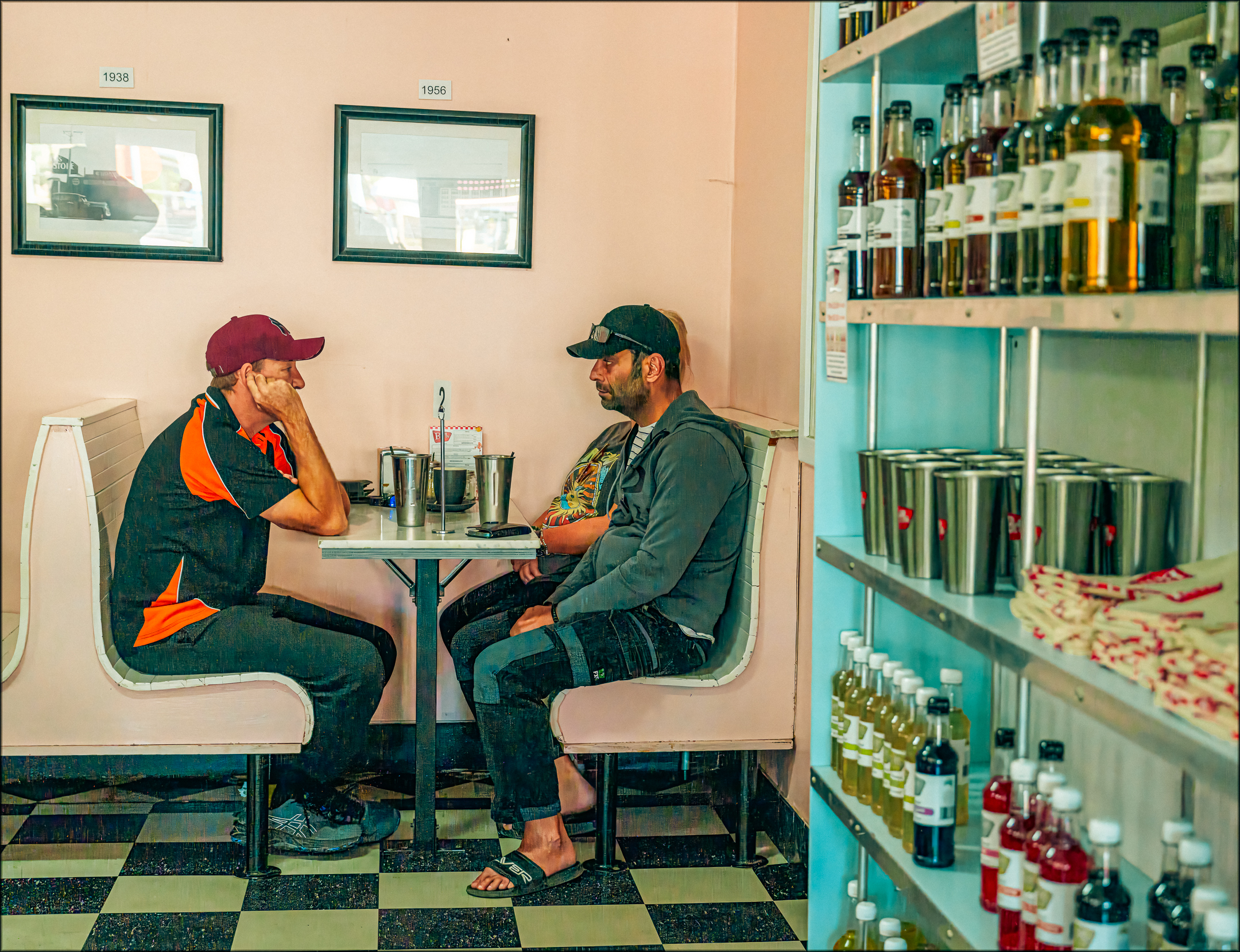Rich and Chris. It is never a good thing to get defensive about one's own shots but I'll give an explanation for the RHS. I liked the lines running in from the shelves but that wasn't the reason for the inclusion. Obviously the message about the milk bar itself doesn't get across and I need to rethink this. The milk bar is a time capsule of the 1950s there really is a jukebox. The place makes all its own flavour syrups and has old time metal drink containers. I wanted these in the photo. I wanted to keep the aluminium strips and the shelving uprights in the shot too - all very 50s. I tried cropping a bit more off the right, down to where the drink containers start, but then the proportion of the image looked wrong to me. So I played with taking some off the top but found I wanted the rectangles of the frames in their entirety.