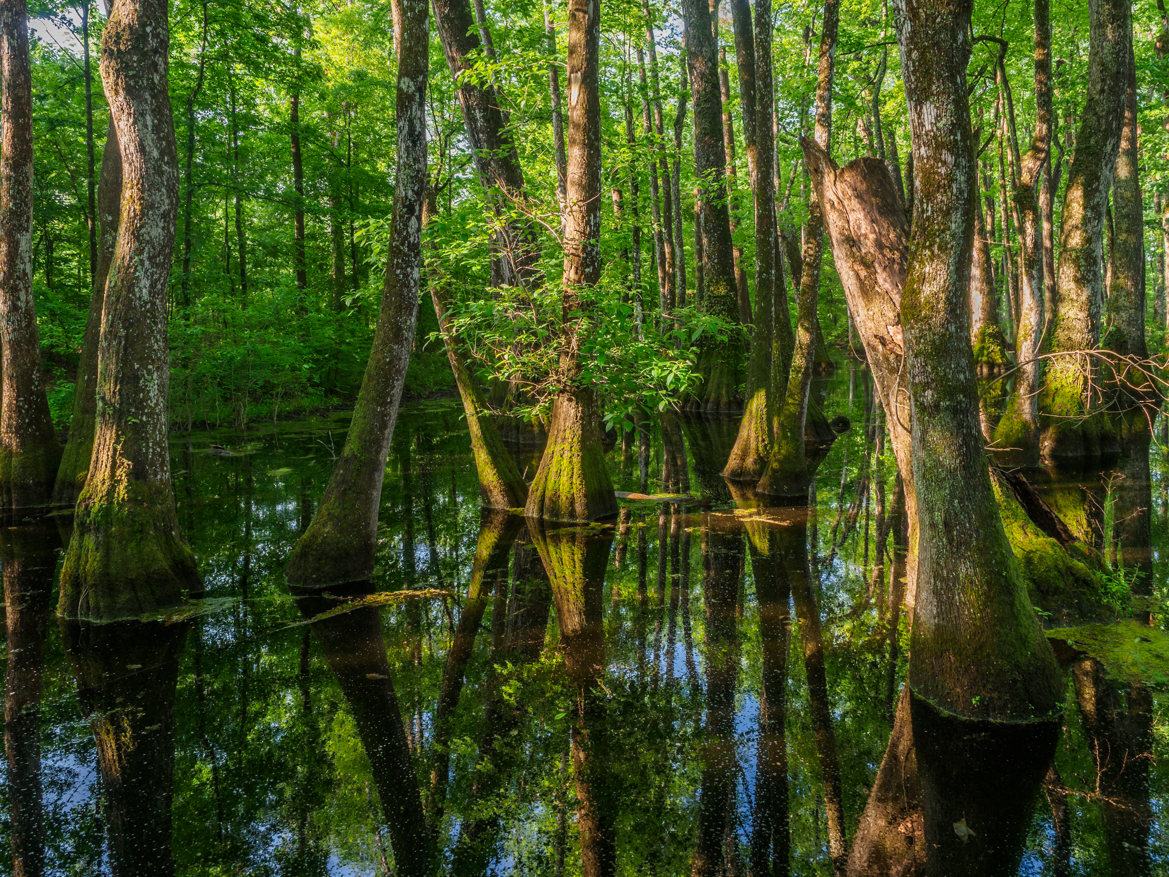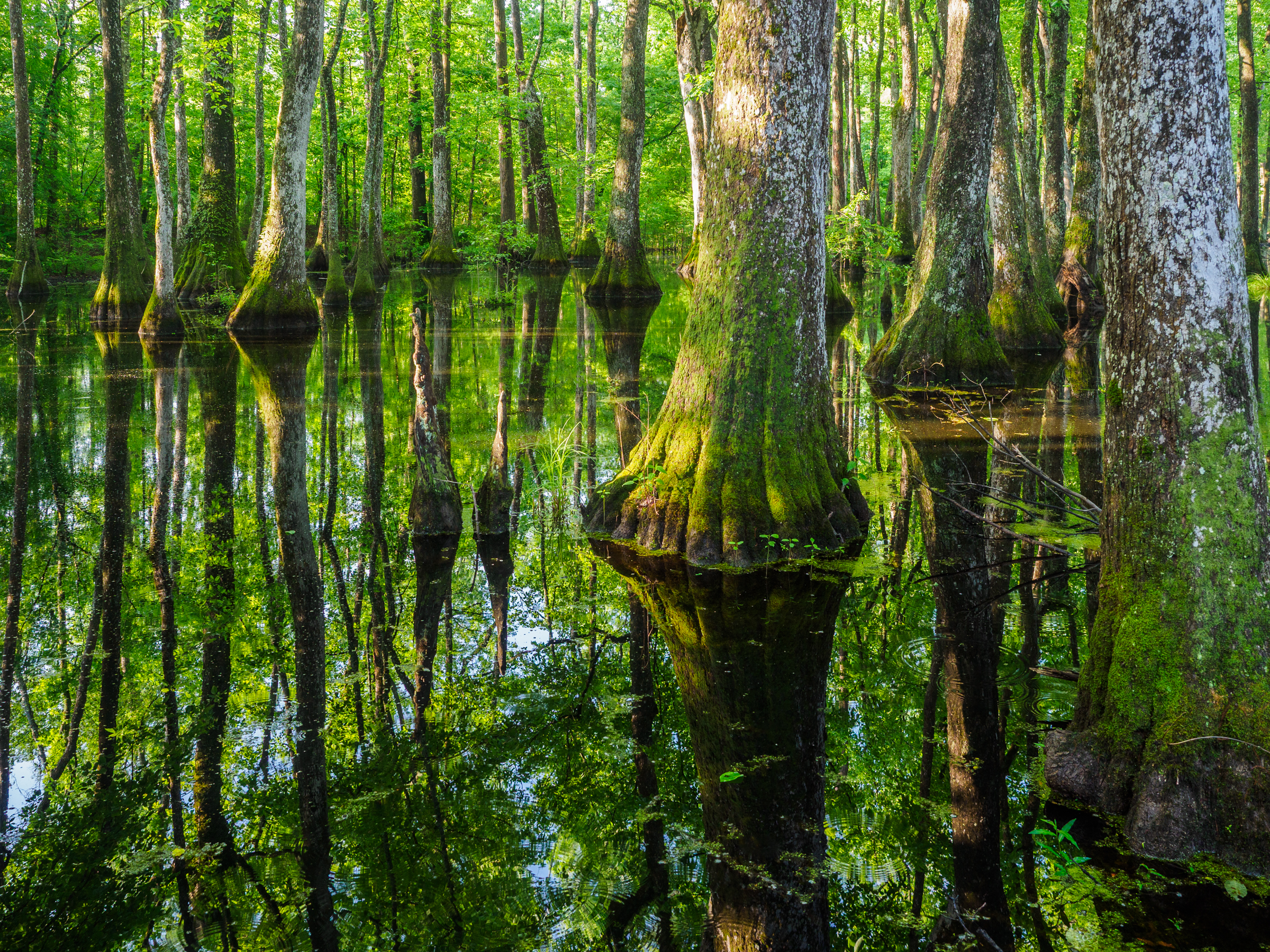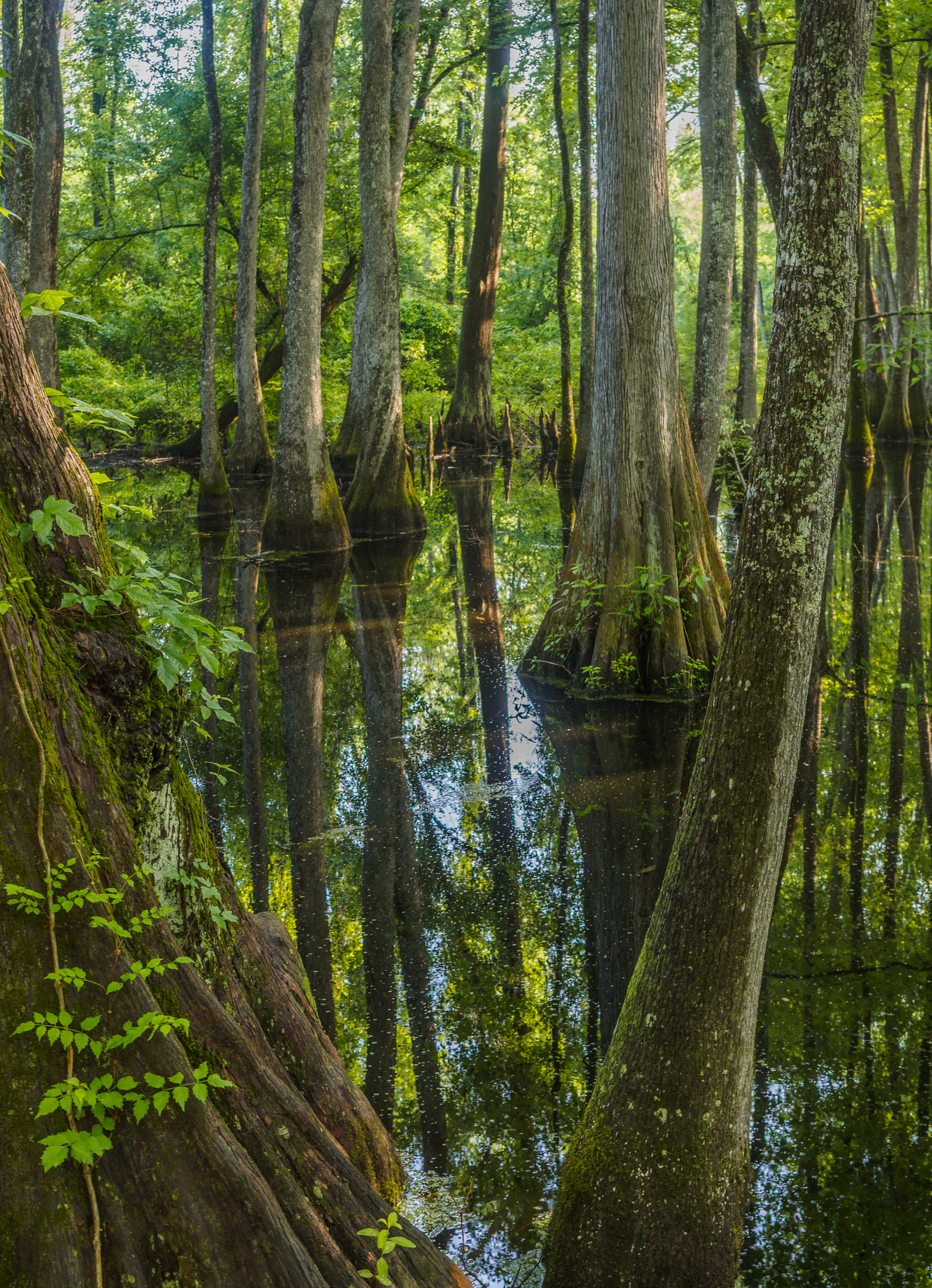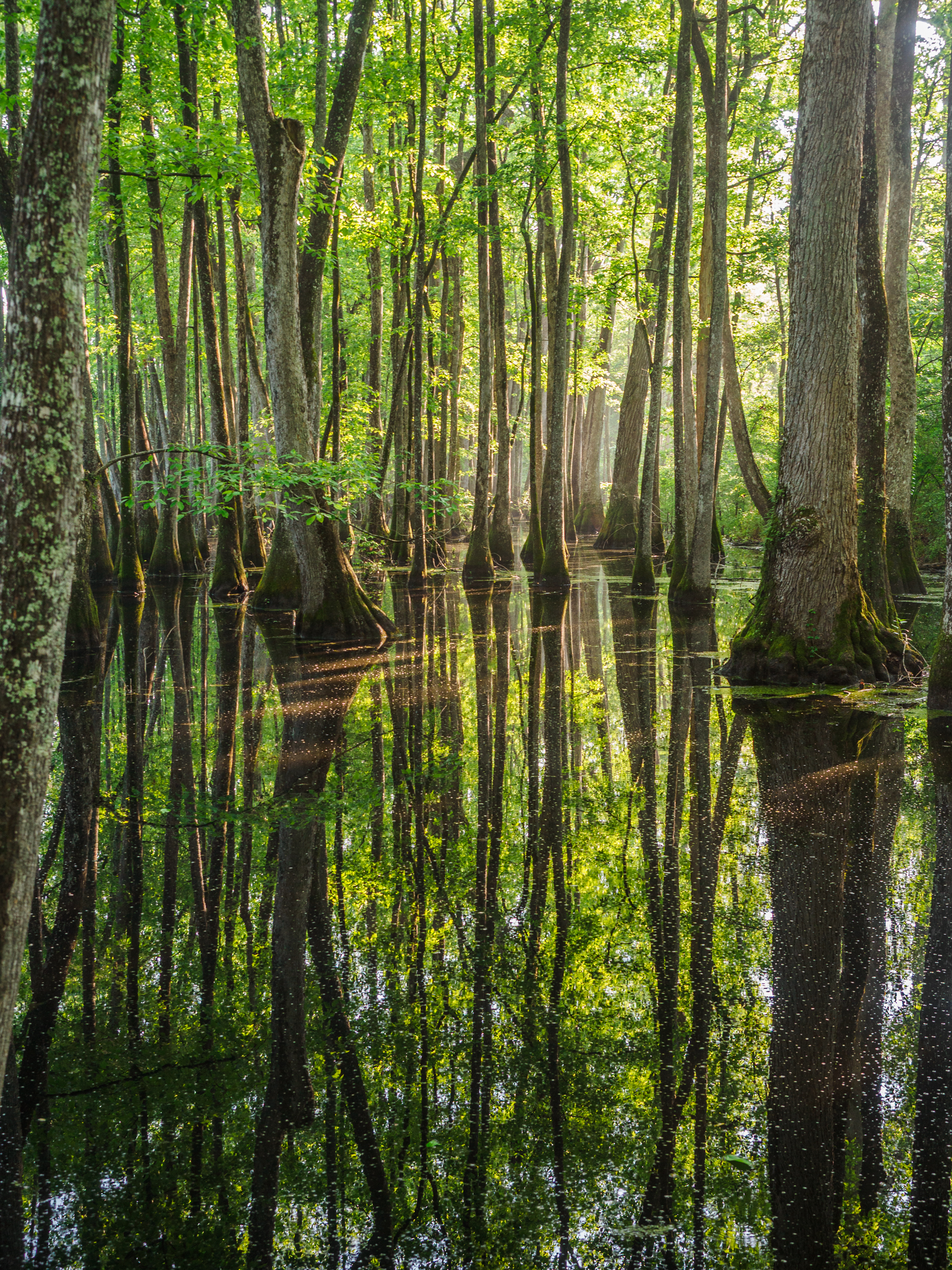 A Walk Around the Swamp yesterday just after sunrise. Spring colors are as fierce as the mosquitos. The swamp is circular, so as I hiked around it and the sun continued to rise, the angle of the light changed - even though the photos are similar, there are subtle differences that maybe only a swamplover can appreciate. The swamp is still recovering from a destructive storm that took down about a third of the old cypress and tupelos and created a markedly different environment within. And since it belongs to the National Park Service, it is no longer maintained due to this year's cuts to NPS. It is returning to the wild.