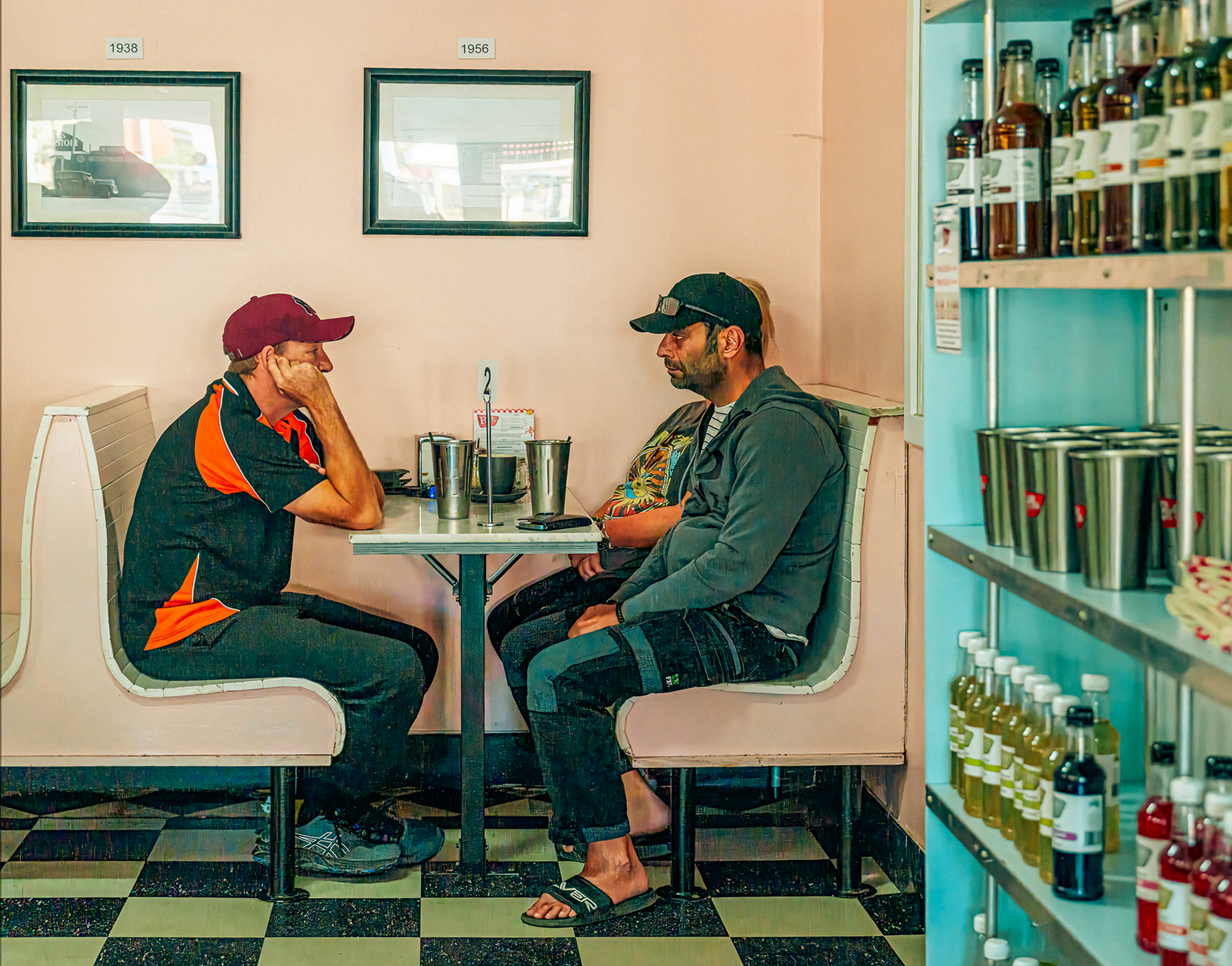 I like it Mike! It has a Norman Rockwell look and the music on the jukebox must have been a very happy addition! For myself Mike, I would adjust the verticals, horizontals, and make a crop from the right. Example below. I did read why you did not crop from the right but personally I thought the crop made the characters a larger part of the image while maintaining the atmosphere of the location. Also, I did not care for the towels so much. For me it was a better balance.