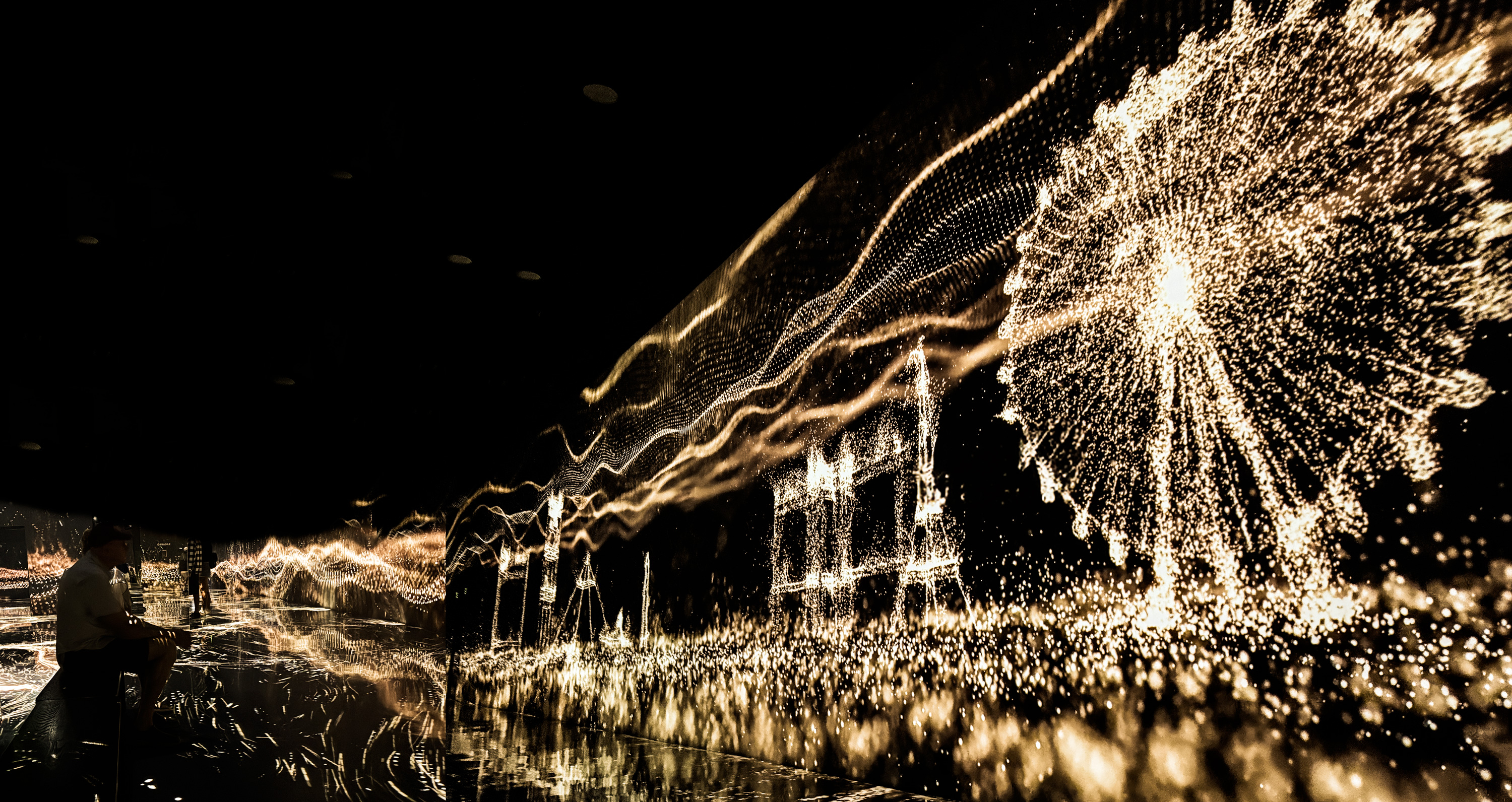 This is a slightly flawed attempt at a pano shot with phone camera in the Arte installation in Las Vegas. I kept it because I kind of liked it, with the lone guy watching the dizzying combination of animated projections, walls, partitions, mirrors, reflections. It was hard to stay oriented to your own body space in this museum, which I think was one of its intents.