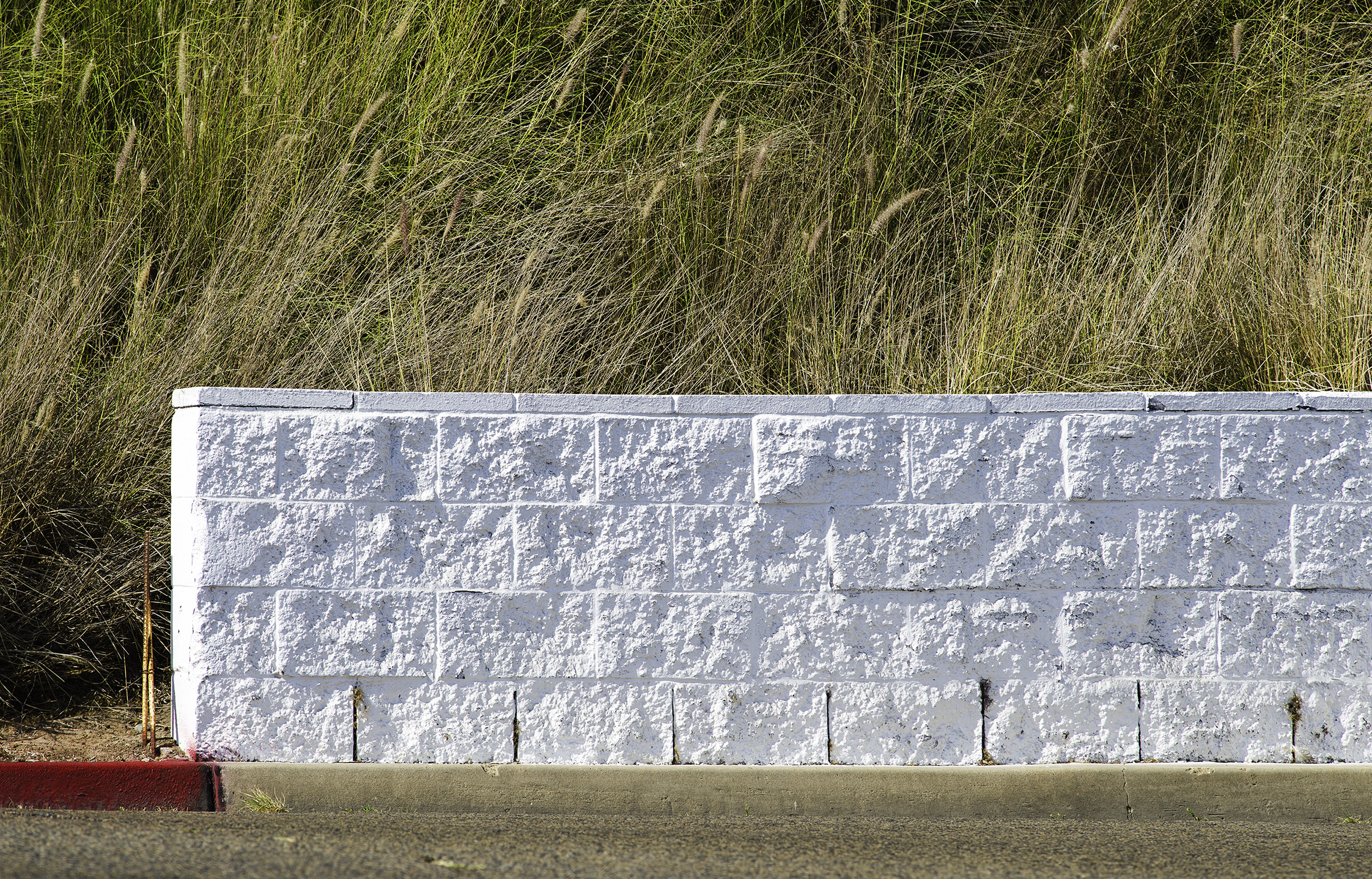 The white wall was almost impossible to look at in the late-afternoon sun. It looked like it was glowing with white heat. The stalks of dry grass on the very steep hill behind the retaining wall looked "etched" in the dry air. The red curb was too good to ignore.