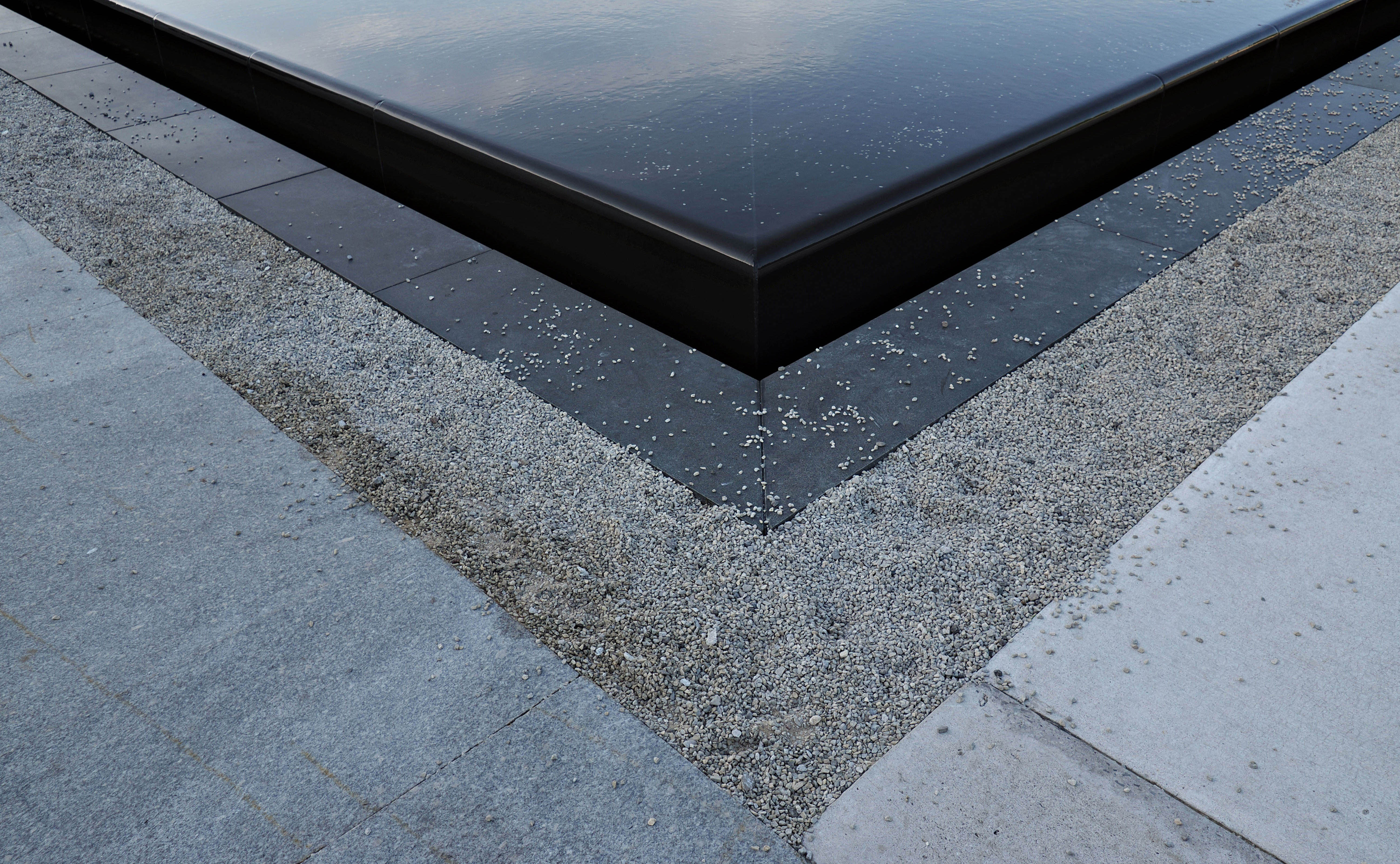 The cool blue/greys and the dramatic black V are powerful here. A suggestion. It's a question of personal taste and style. I'd consider abstracting image further to those features by cropping out the greenery. It reduces the image to the sharp edges and andgles that I feel are its strength.