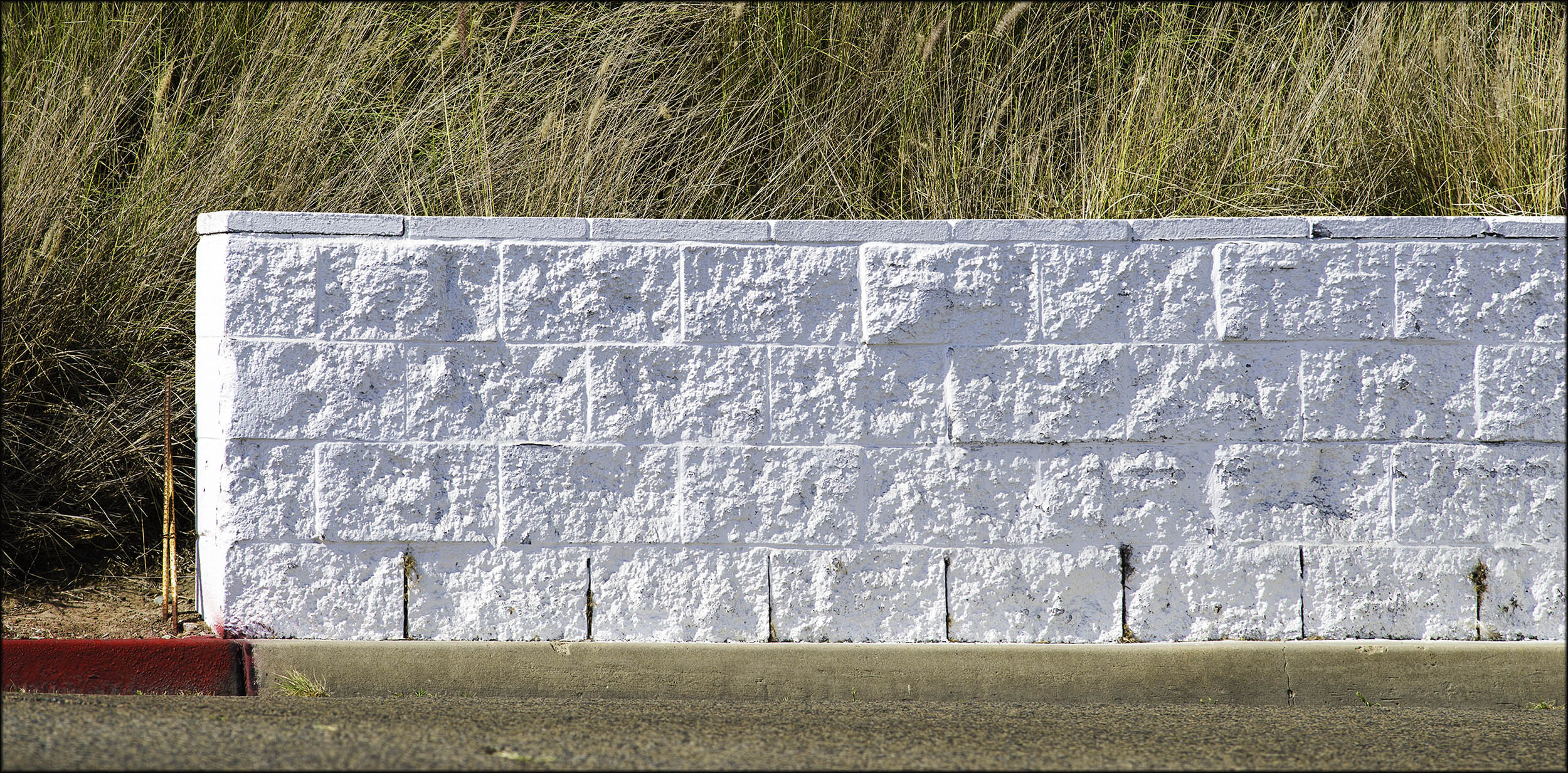 I probably could have made a pretty good composition with just the red curb, the paint splash, the rebar and the left end of the wall. But what looks like an empty street was filled with passing cars!