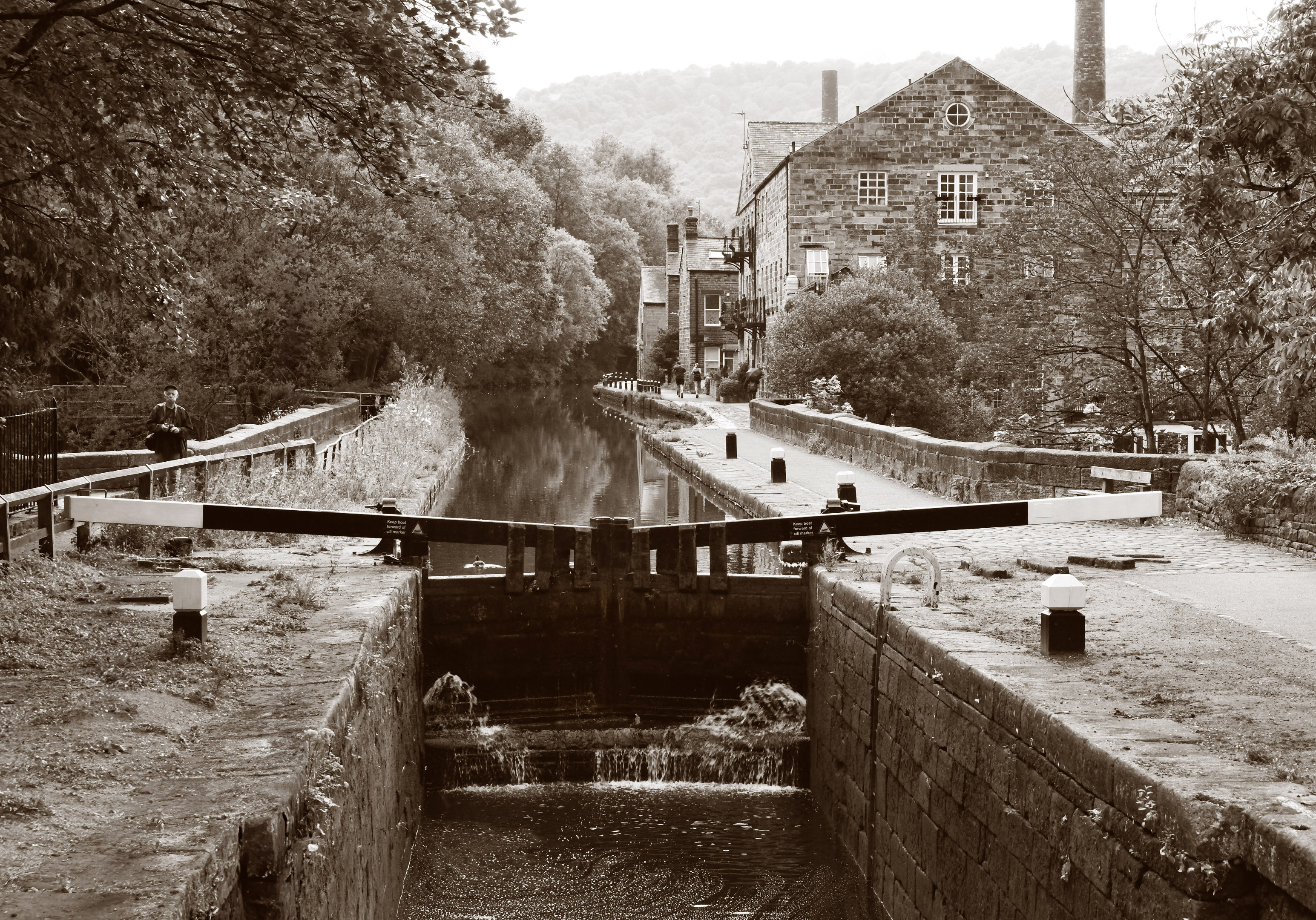 Now we/you have found a style. Then it's time to figure out how we want that image to look. It might be perfect at it is but here may also be things to improve or try. I took your image and made the leaking water at the bottom of the lock doors more sparkling, increased the contrast locally at some places (mainly the trees and the building), I removed the elbow to the extreme left and while being there I also removed some other things to the left that weren't to my personal liking, repaired some damaged caused by my quick monochrome Photoshop action tried without much of a success to remove the obvious satellite dish on the building: