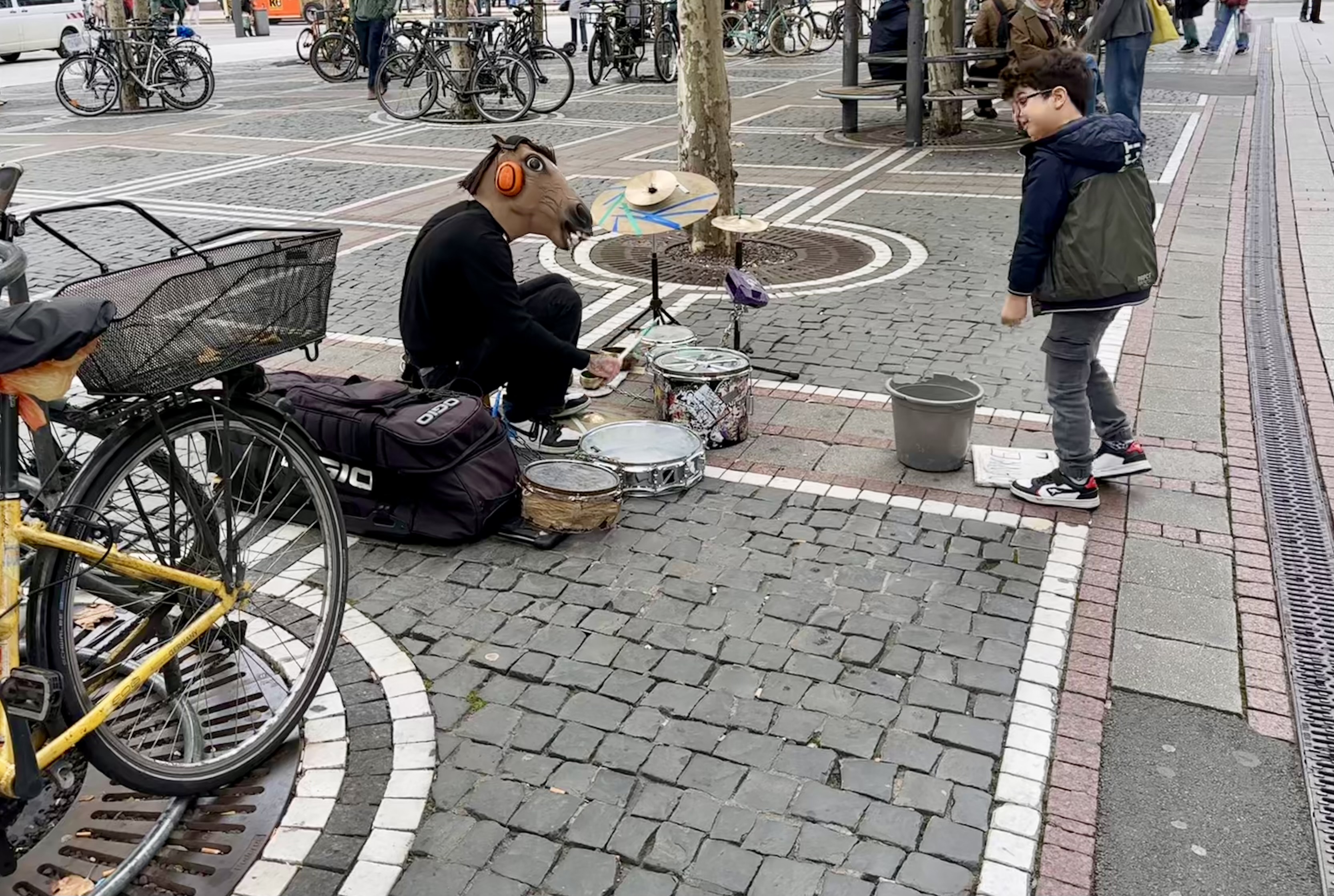 Well caught moment with a most unusual street performer. (The only horse-headed street performer I've ever met was outside Edinburgh castle). The child who's about to drop a tip in the bucket is equally interesting. The shot is neatly arrayed in those geometric squares and circles with strong lines to lead us from lower left to upper right corner.