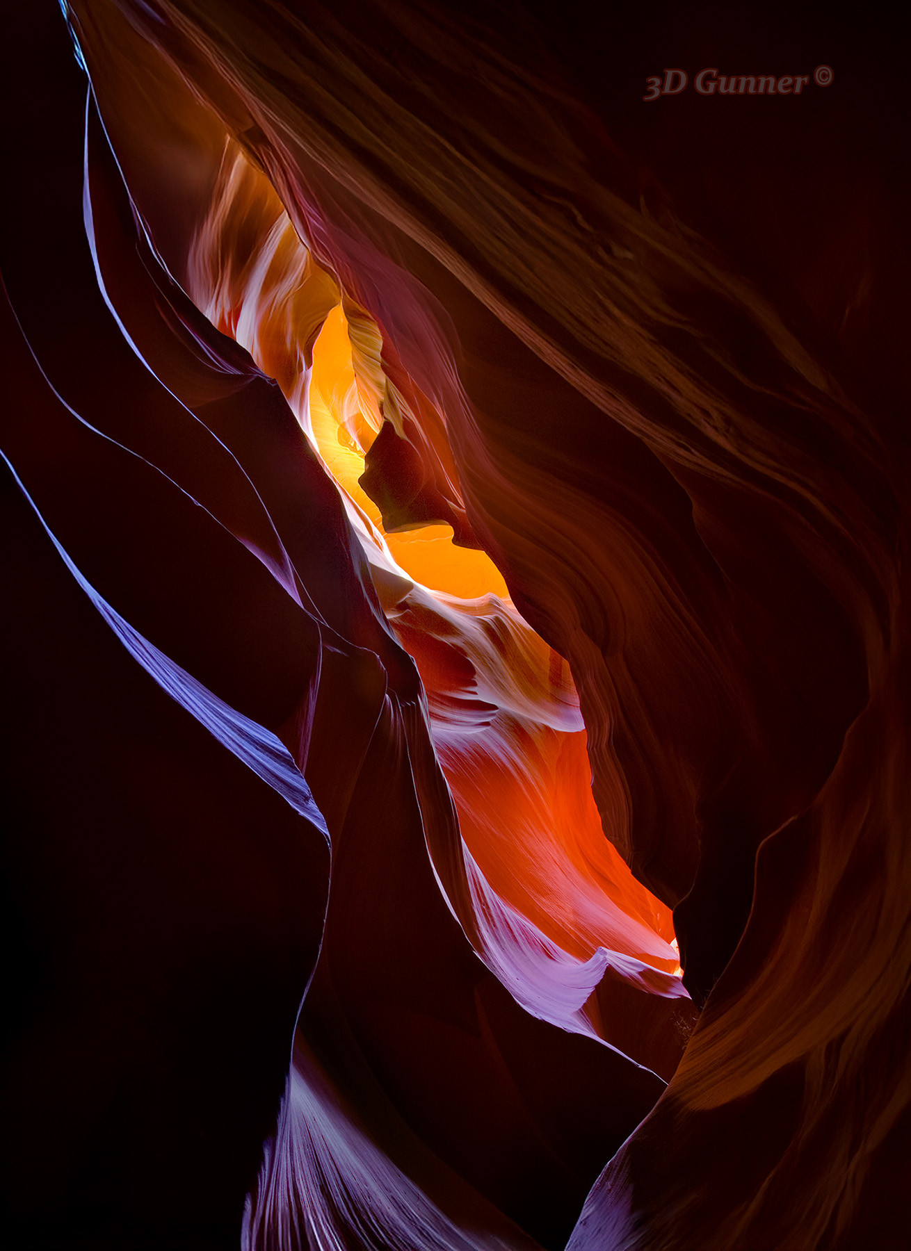 Antelope Canyon is a natural gem (Arizona) and was formed by the erosion of Navajo sandstone due to rainwater that caused flash floods. Over time, a canyon with spectacular erosion forms as "flowing" shape, has deepened, with a specific warm color in the areas where the light from the surface reaches.
