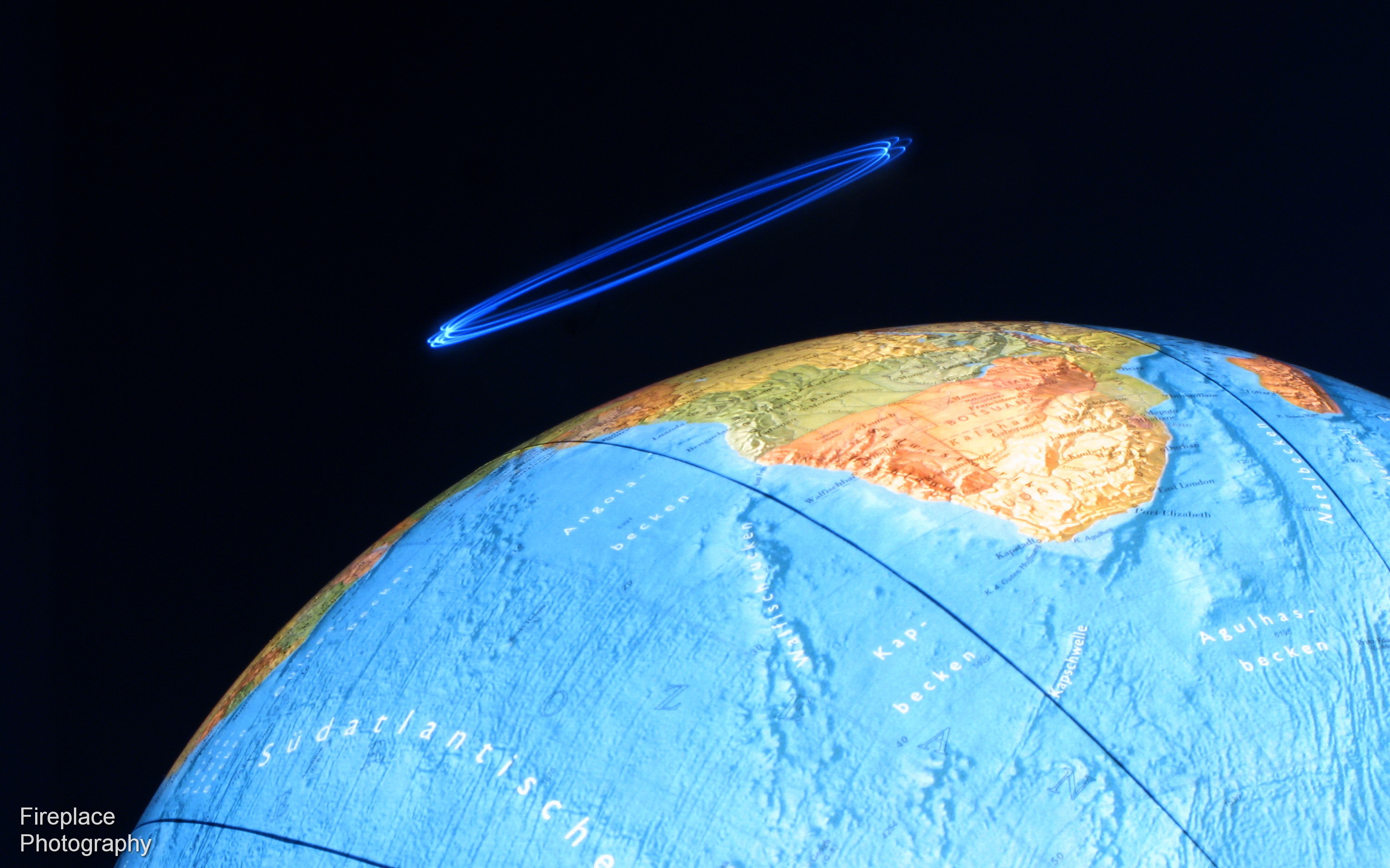 Then set it, like a pendulum, moving in small circles above the globe and took some long exposure photos from different positions.