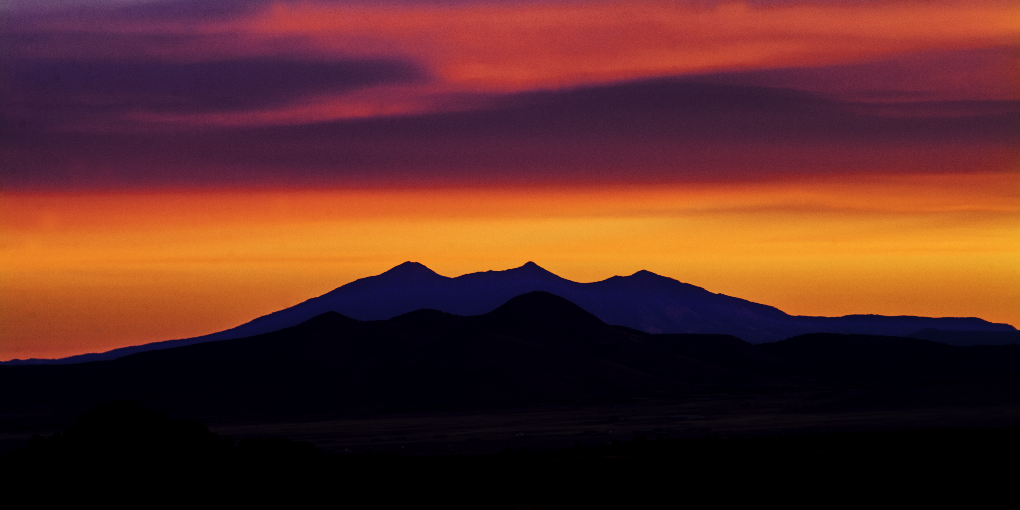 Sunset and the San Francisco Peaks at Flagstaff, from Prescott, AZ. Mingus Mountain in the Black Hills at 20 mi. silhouetted in the mid-ground.