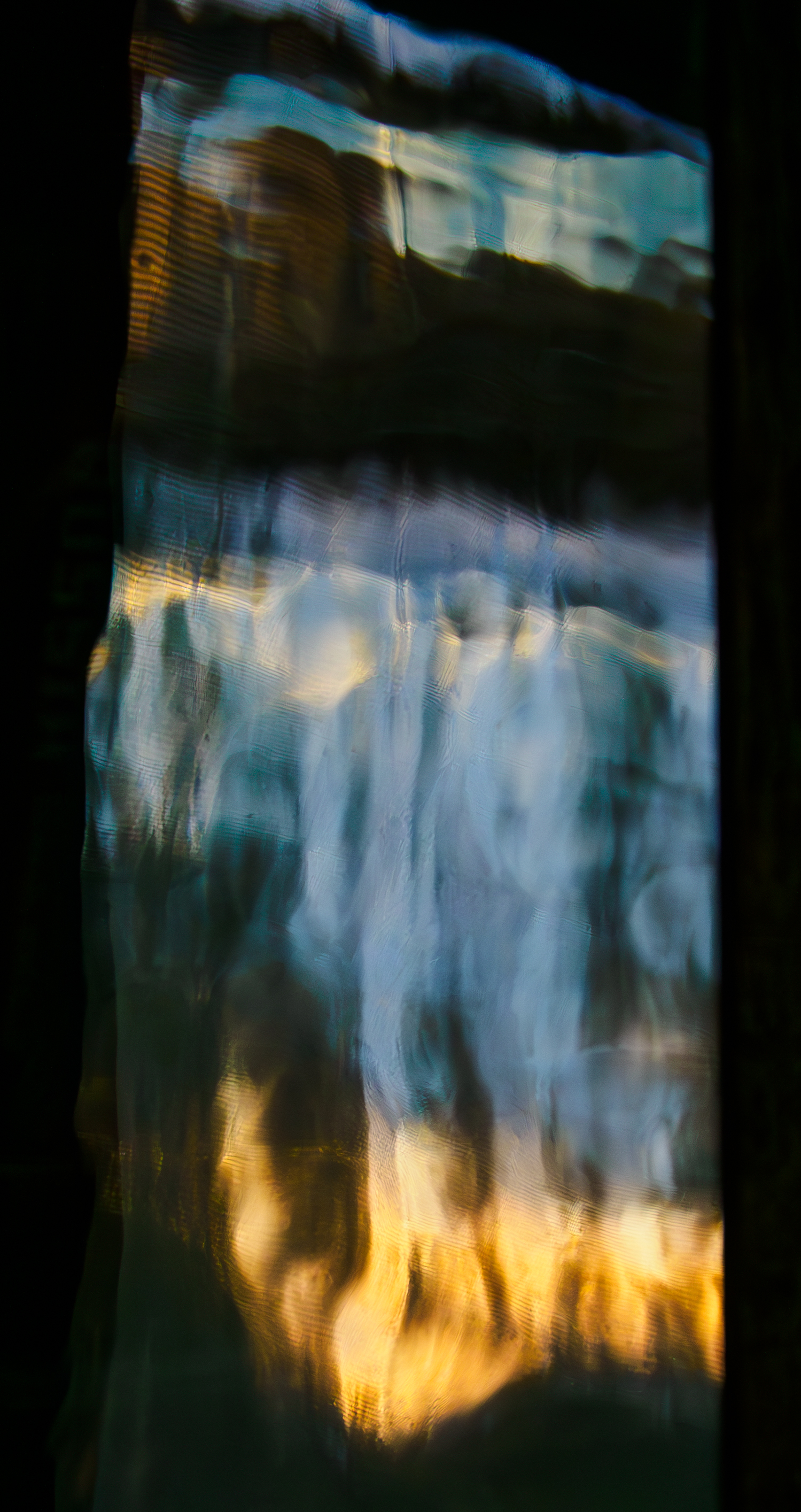 I have an old house whose windows are that wavy 1900 type glass. In my living room there is an antique book case that also has wavy glass doors. The light and color from colorful sunset will make its way through the window and the woven curtain then reflect off the book case. One day last fall it made this. If you look closely you can make out old books on the shelves inside the bookcase and some other stuff in the room.