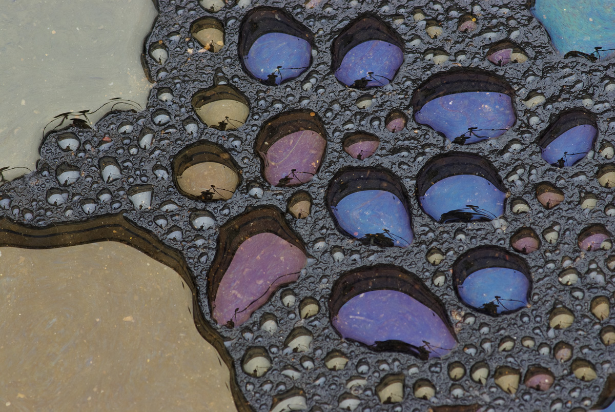Vehicle fluids on asphalt. Saw this leaving work and spent the next two hours photographing it. Pentax K10D (ccd sensor). F14 1.3 seconds ISO 100. There was a slight drizzle the whole time. Luckily the camera and lens are weatherproof.