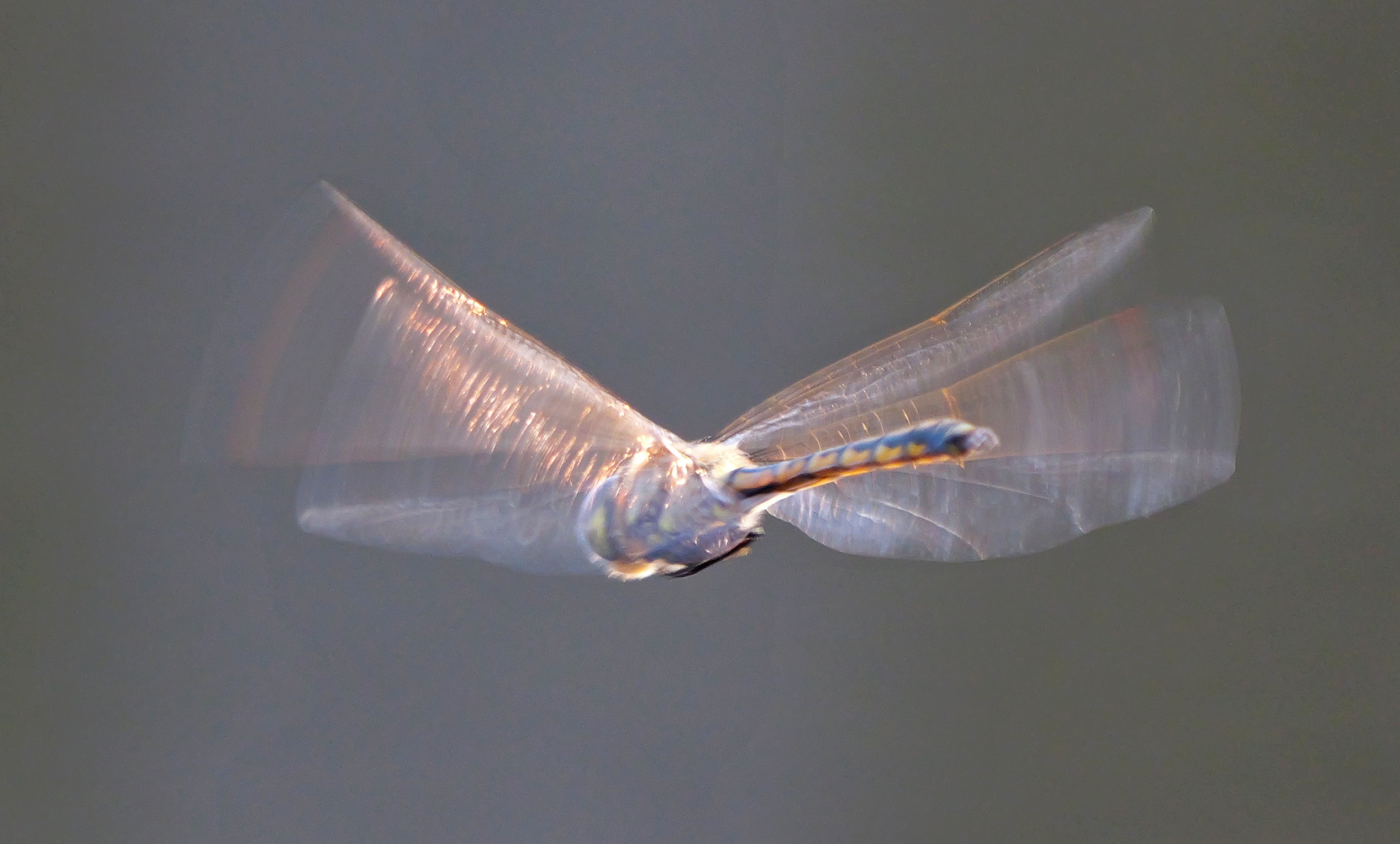 I took maybe 5 series when one was in an area with lots of reflection (first two were with normal metering and just a mess of overexposed washout). Only one series survived and out of that I kept just two images where there wasn't too much motion blur on the body and the wings had some nice patterns.