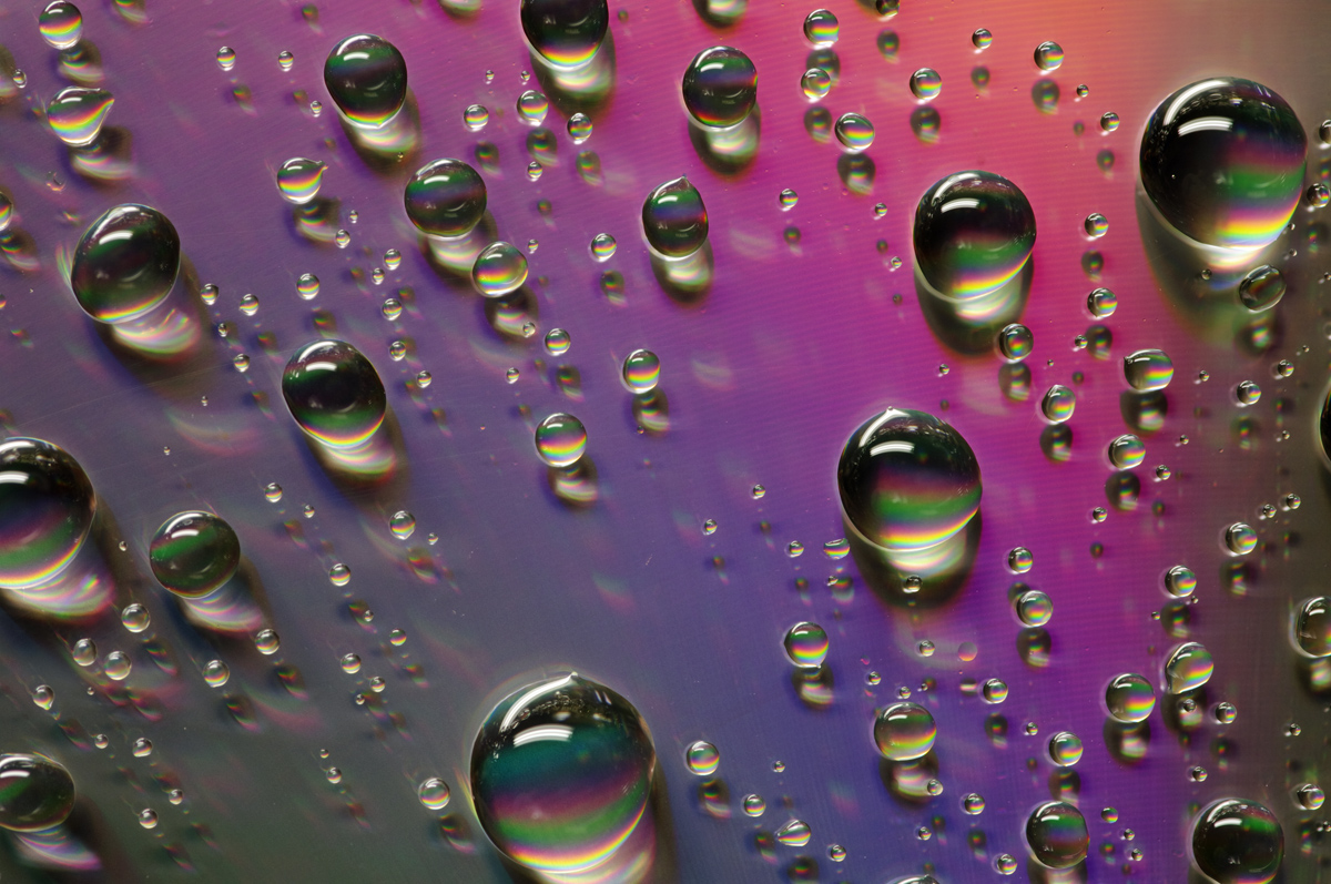 Water Drops. Different lighting this time. This shot placed drops on a tablet screen. Backlighting makes intense colors. Used the Pentax DFA100 macro lens for this image.