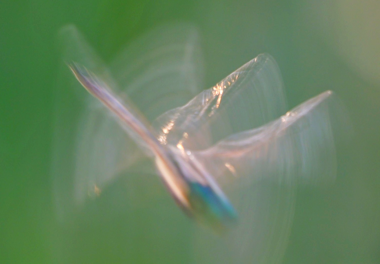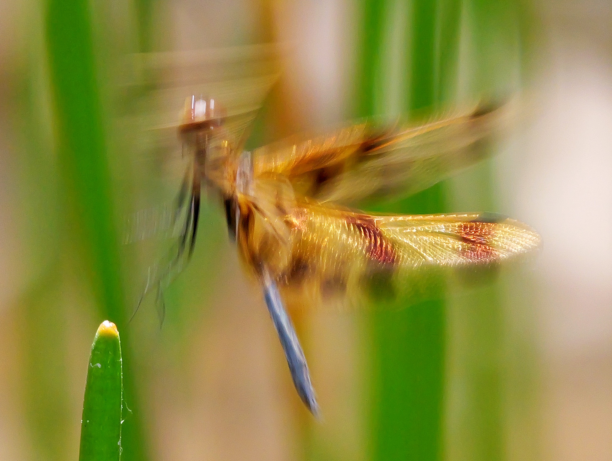 Even if I capture a hovering dragonfly in focus, when it takes off with a turn it always goes oof before the AF can catch up. And there will be at least some motion blur unless I happen to have a quite high ss. Here, later afternoon with lowish ss of 1/125, the motion blur shows just how fast these critters can move. I also wish to note the difference in wing motion. These guys are masters of flight. Notice the rear wings have beaten through their full range at least once in the capture but its right front wing has moved through a quite small range and its left wing somewhat more so. They also have the capacity to alter the pitch and beat frequency of any wing affecting their flight as required.
