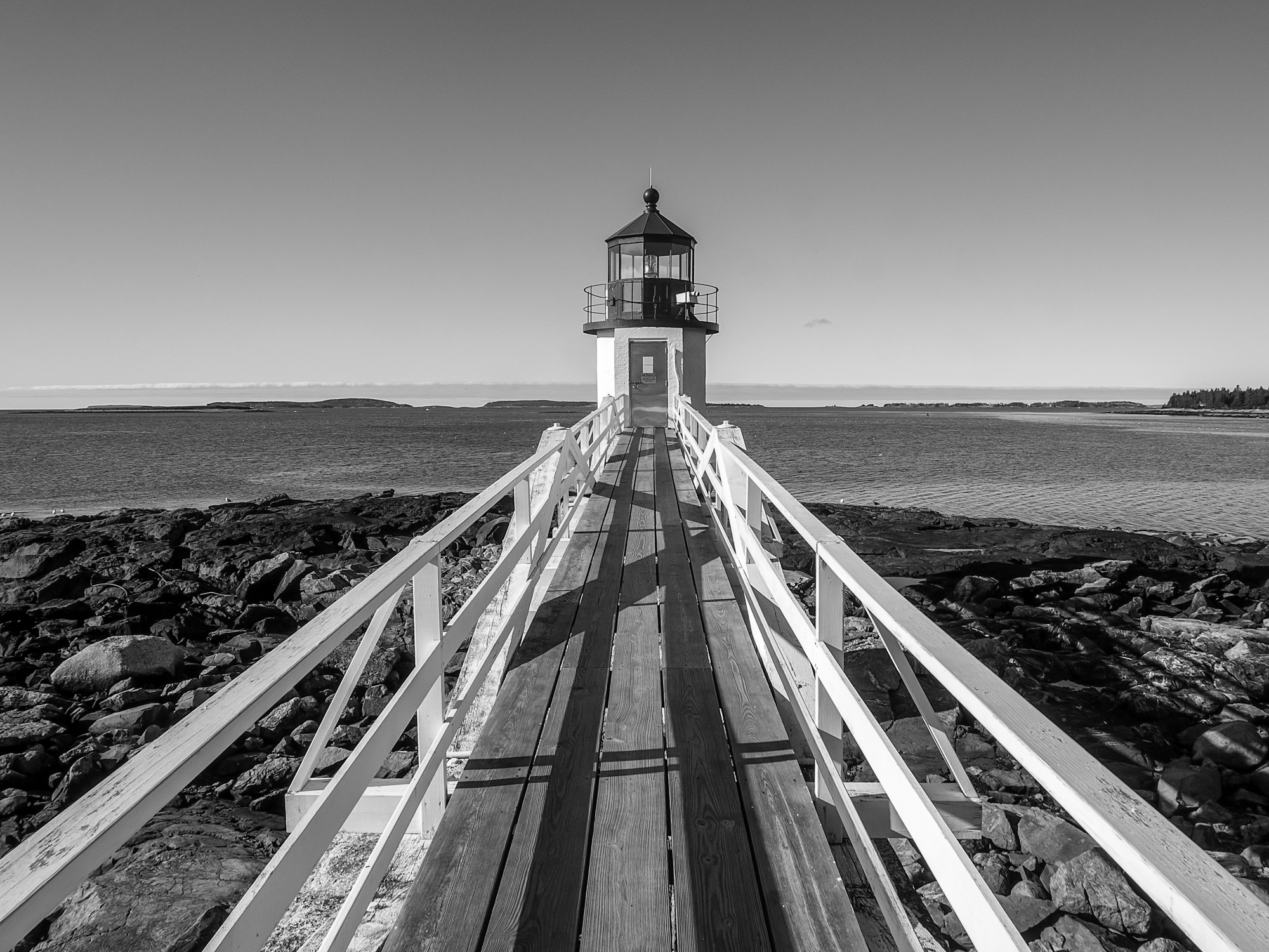 Nice use of the "wide angle perspective." This is an idea composition for that approach. The exposure captured the weather wood on the hand rails nicely and also the tonality of all the highlights. Interesting this seems to be a rather short lighthouse.
