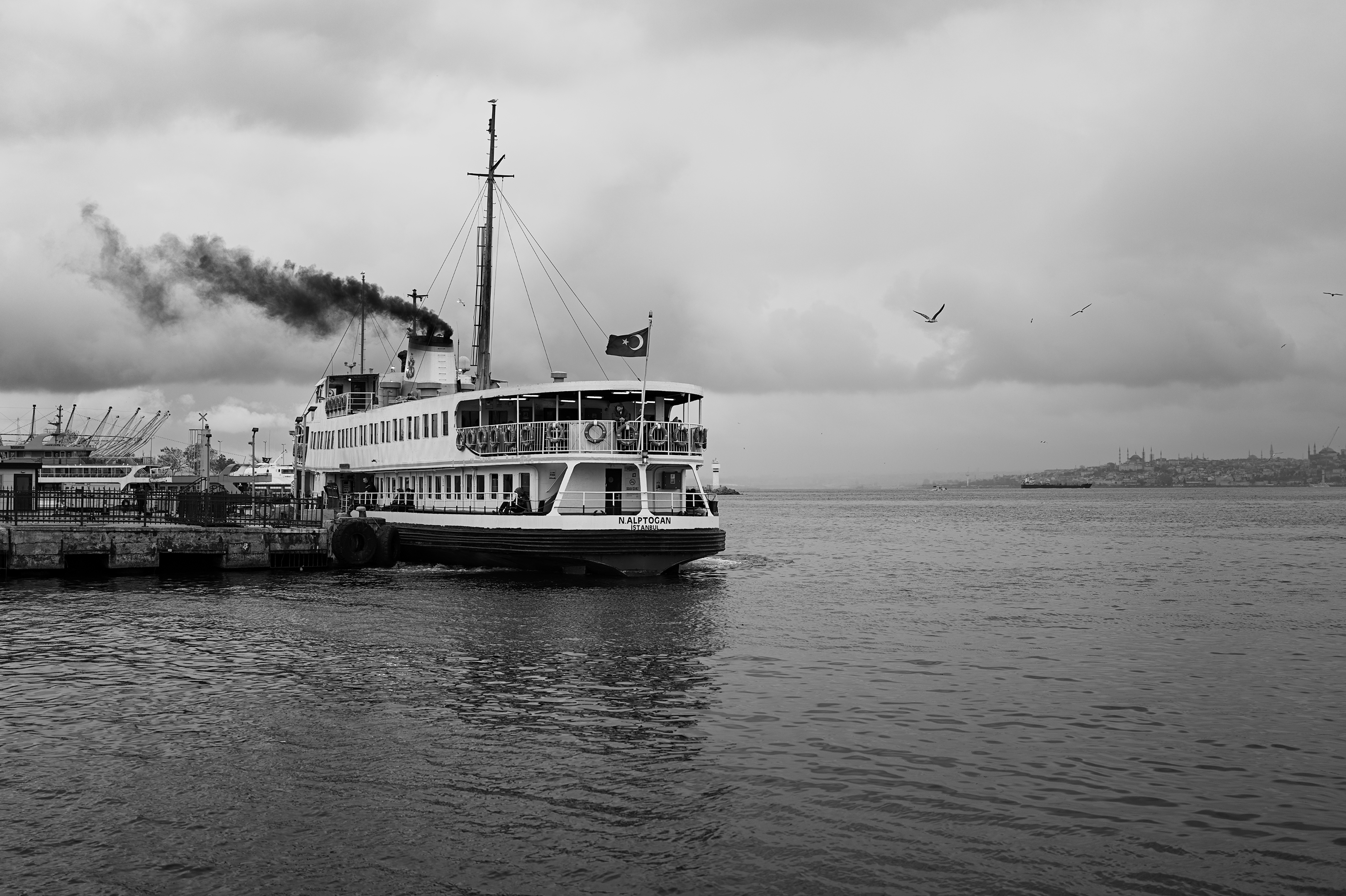 Noice balanced composition. Interesting subject and nice tonality in flat light lighting. On the ferry on an overcast maybe stormy day.