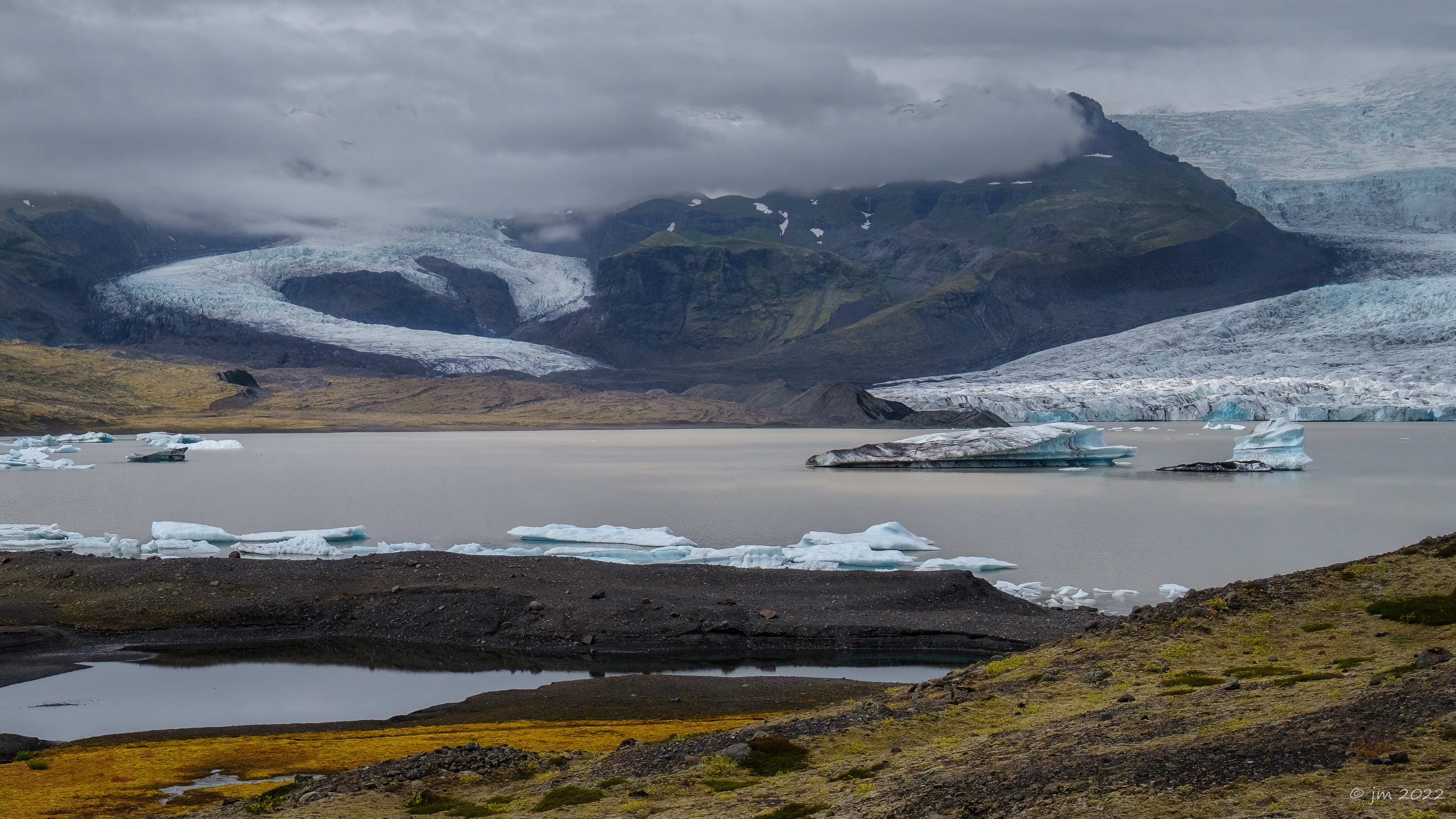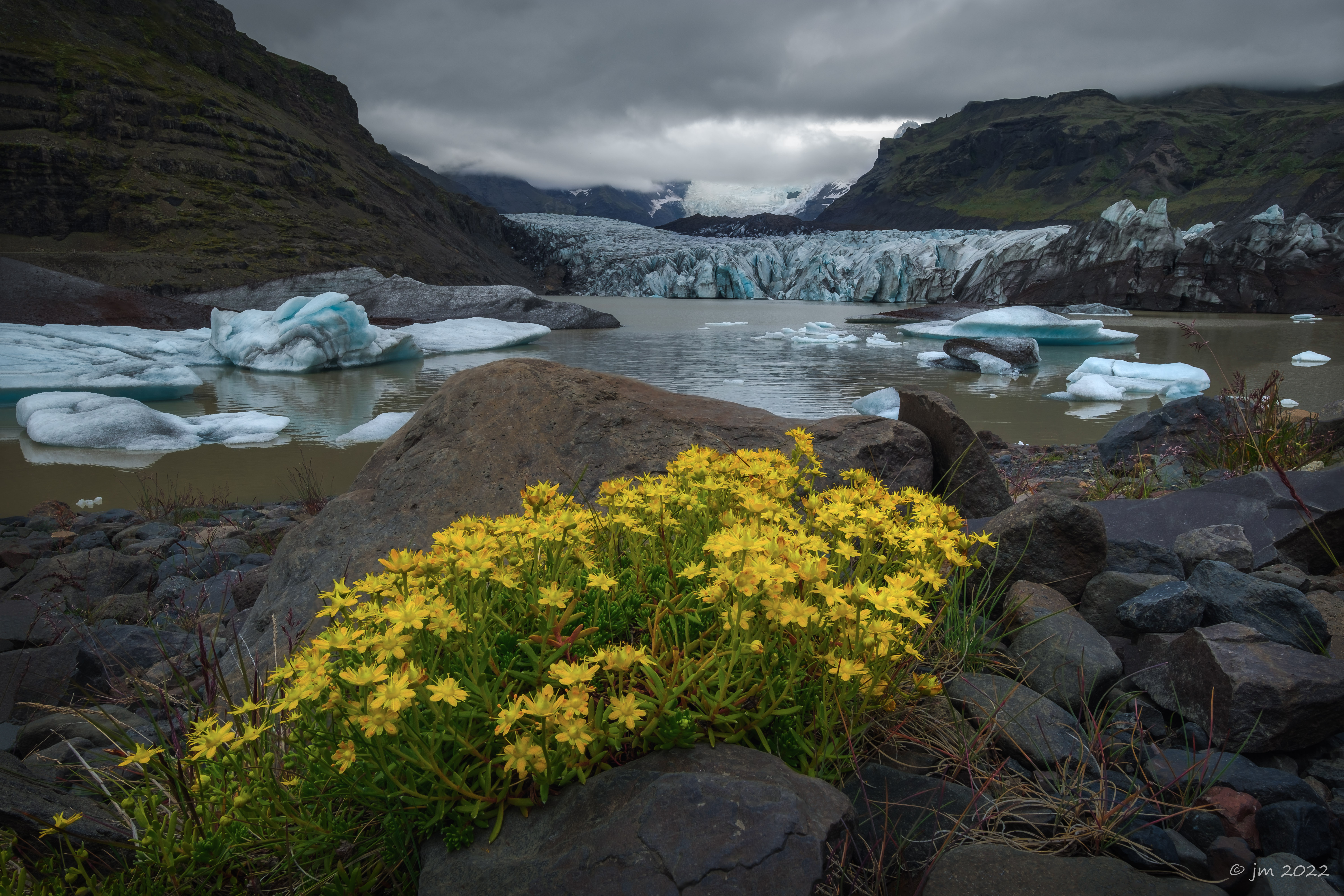 This last one with the yellow wildflowers is a real good one. Great contrast with the glacier and small bergs!