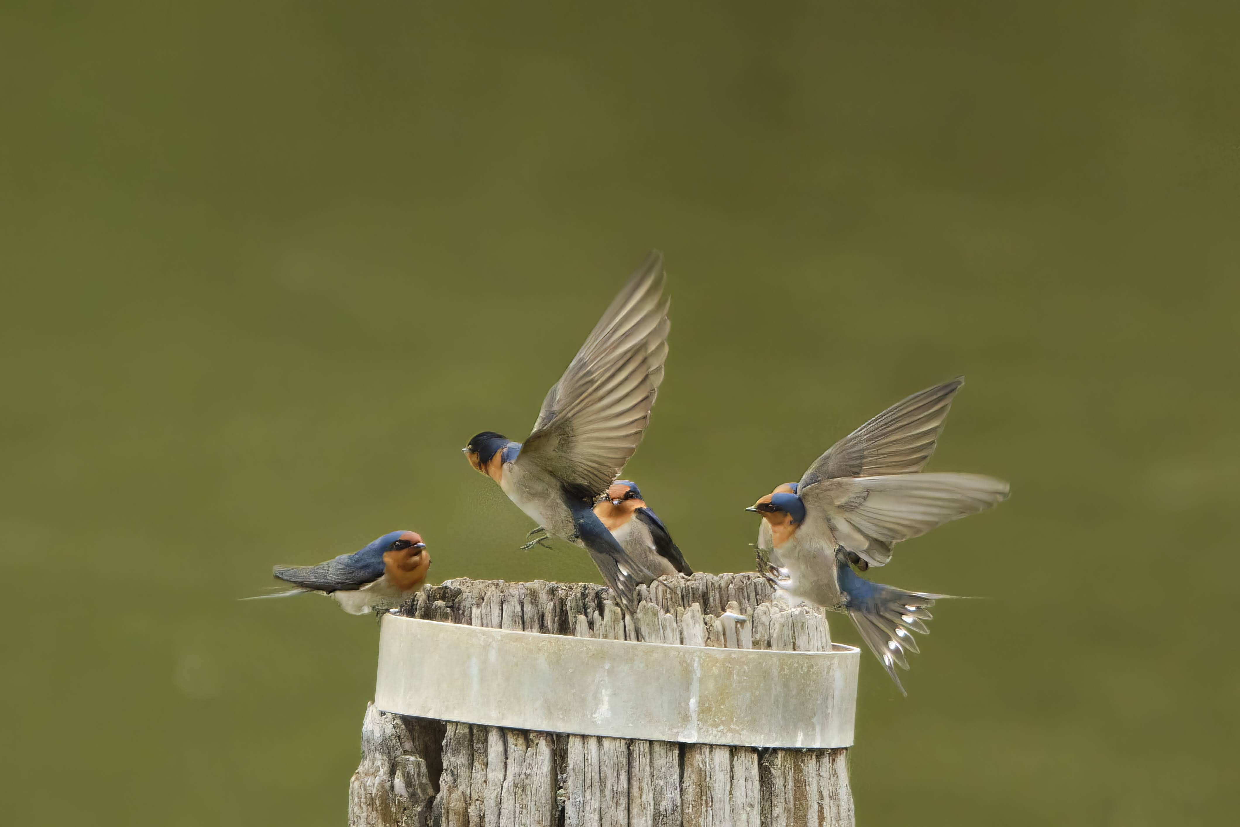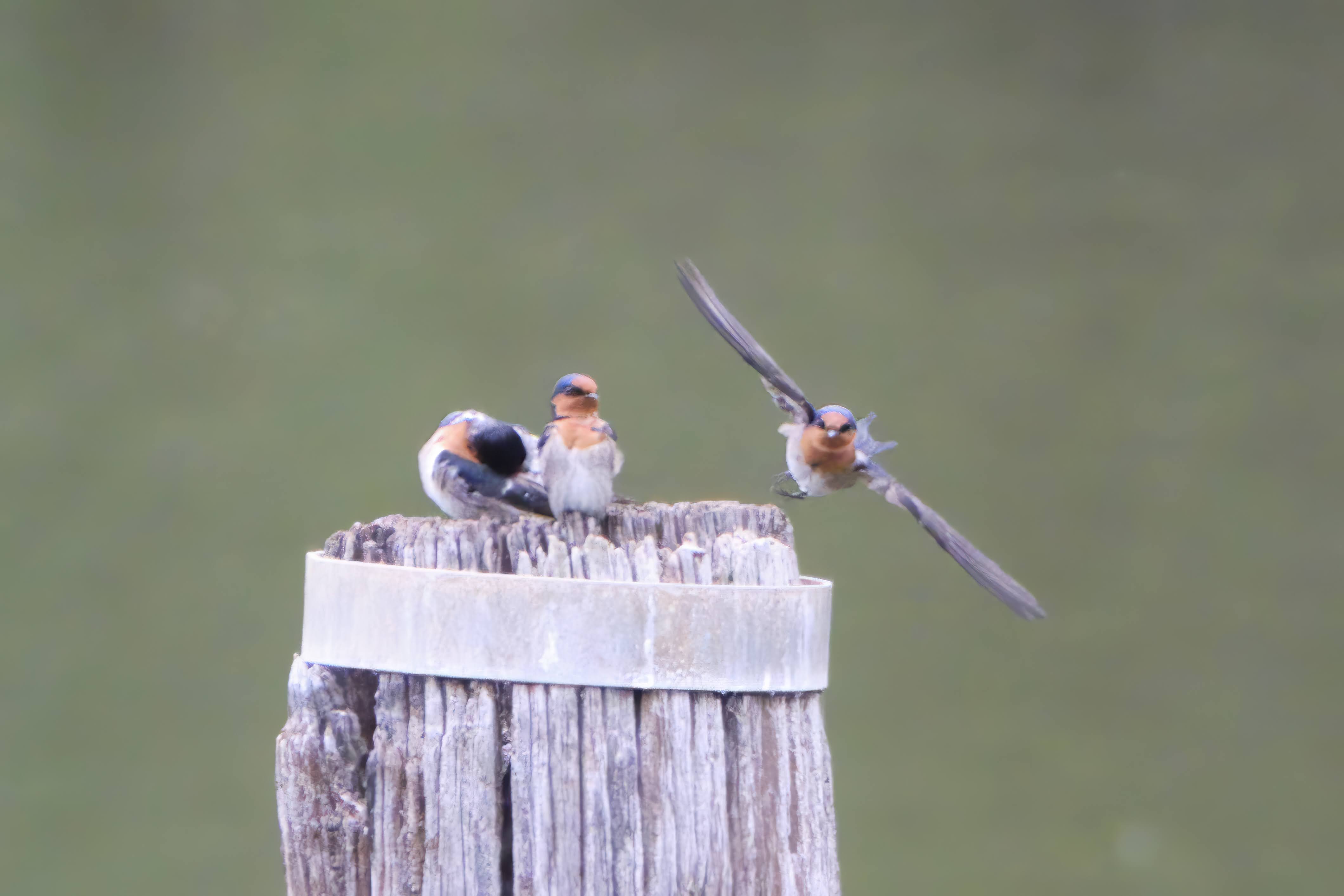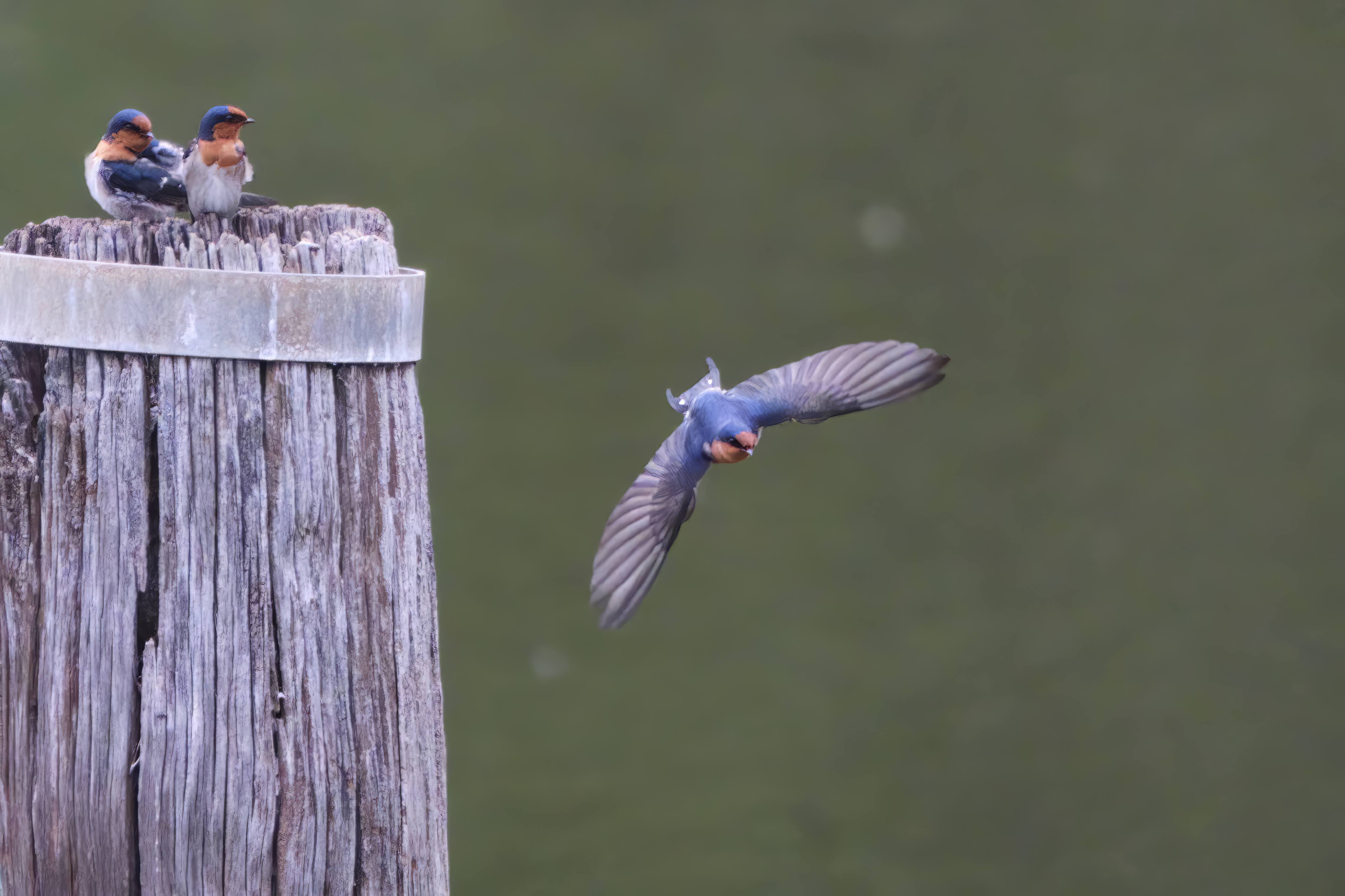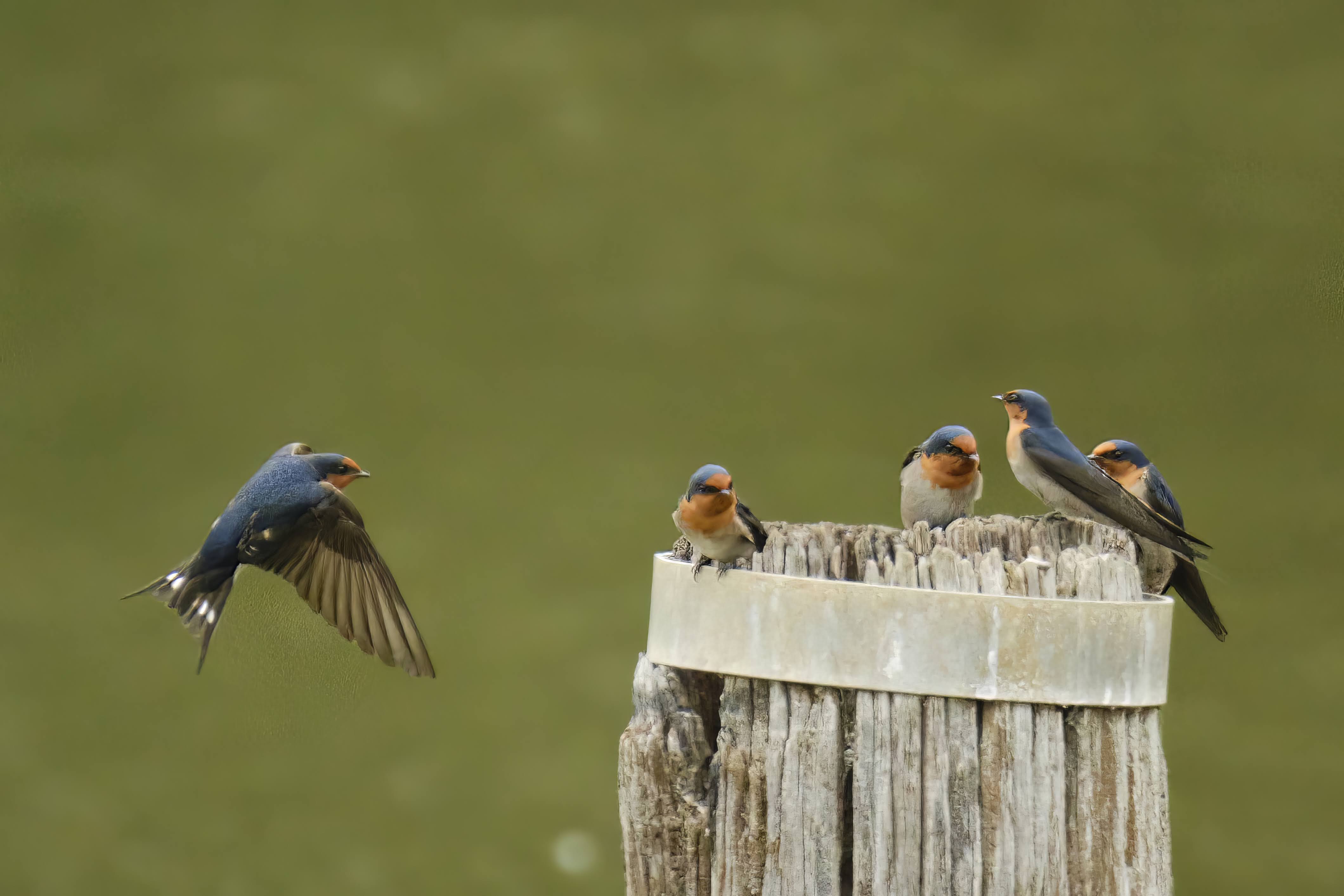 Some Welcome Swallows on a post in the middle of the lake.