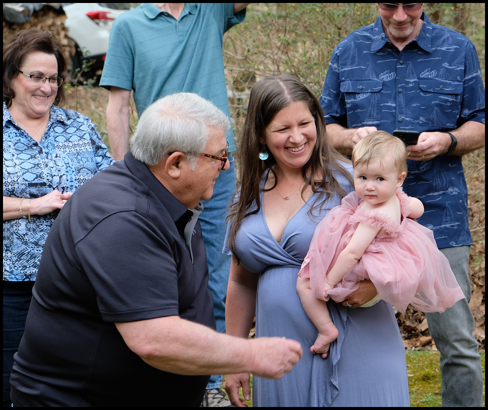 Youngest granddaughter watching the ceremony from the yard in front of the deck:
