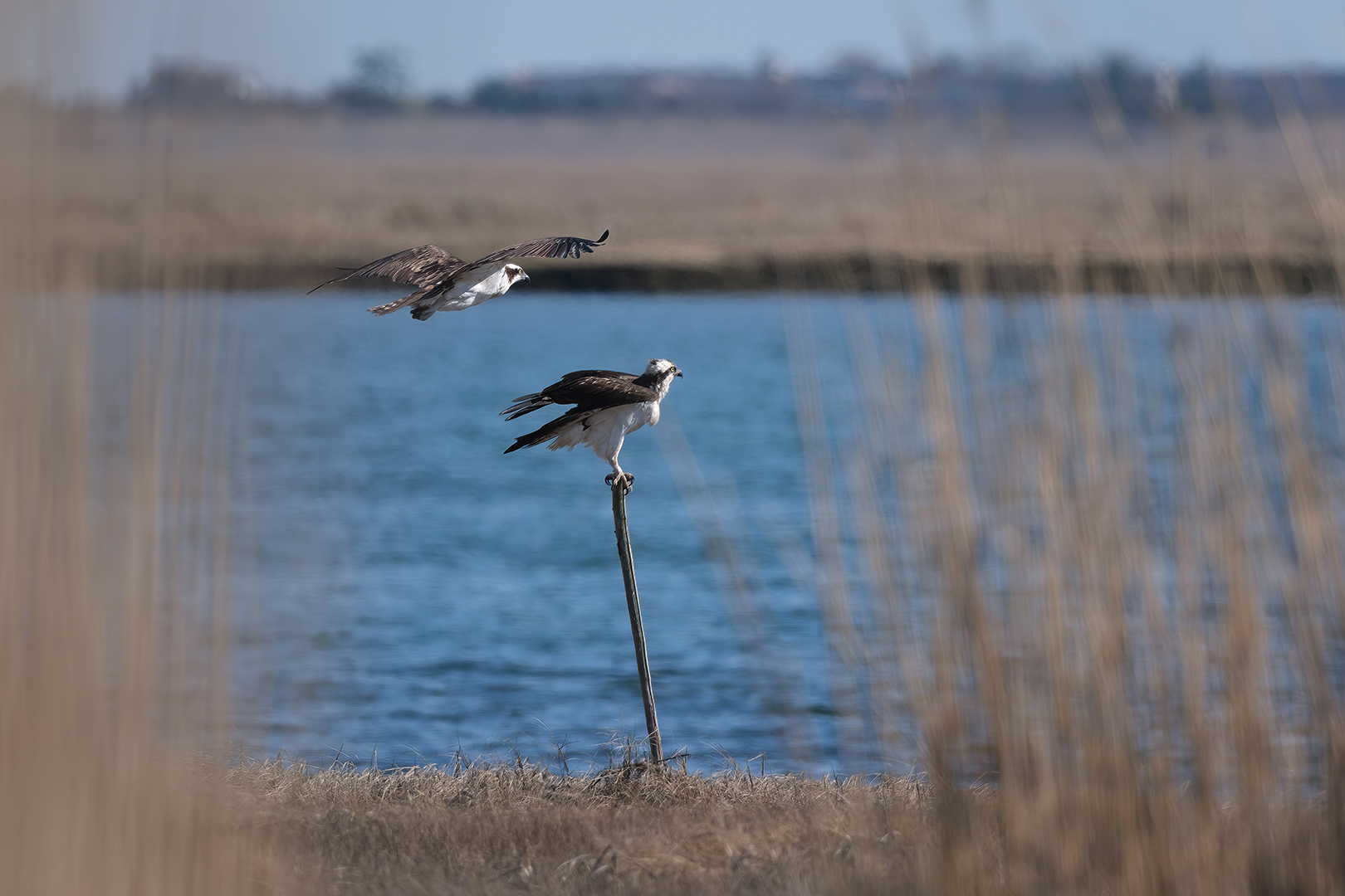 The osprey couple at the Marine Nature Study Area in Oceanside, NY has been getting along well. There is another male that has been trying to chase off the male and take over. I witnessed this as the male relaxed on a perch near the nest.