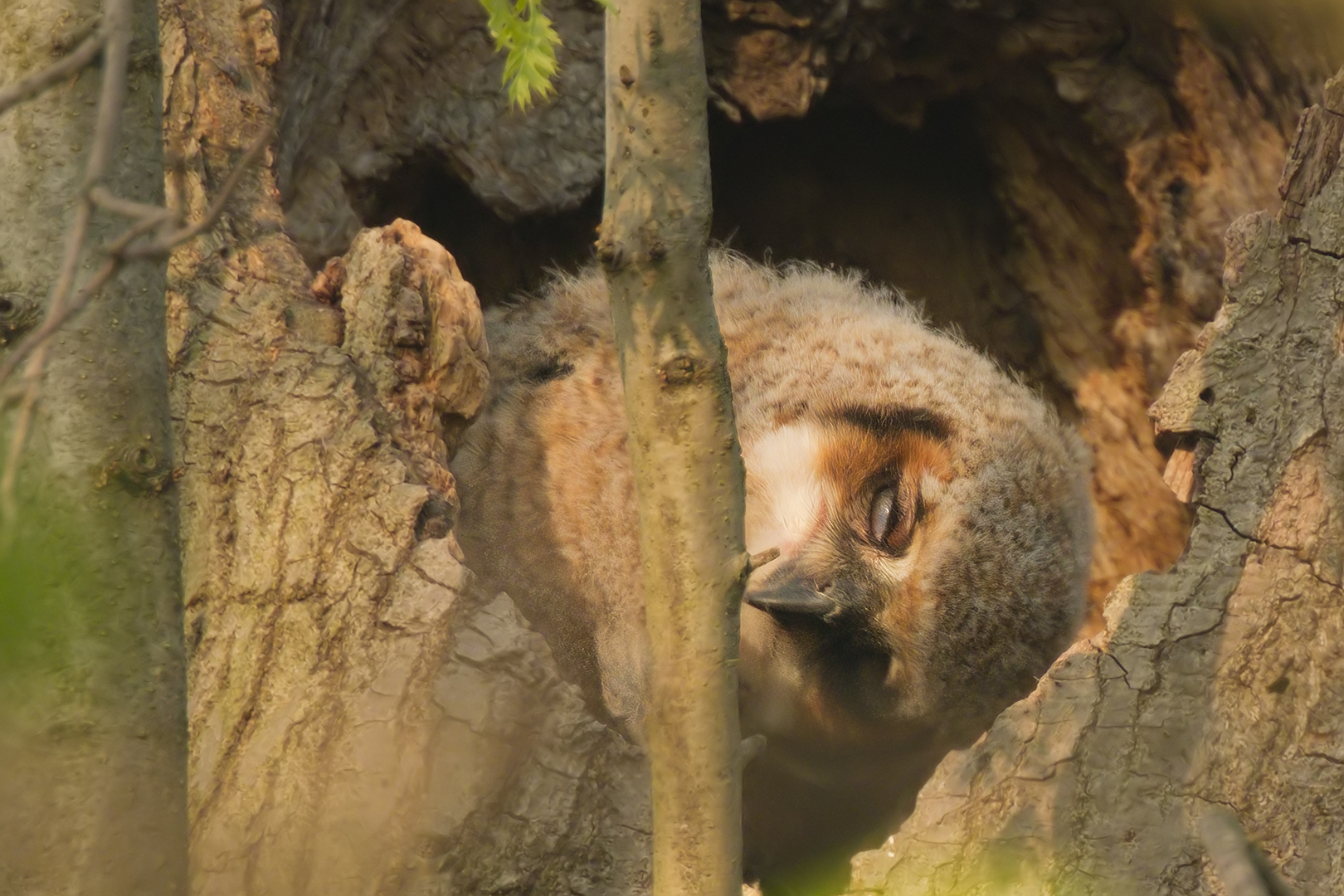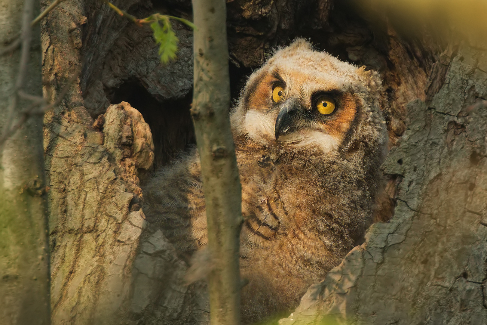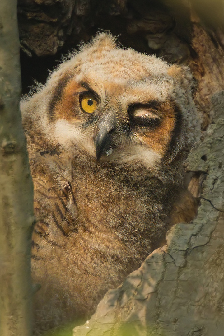 Great Horned Owlet, classic behavior