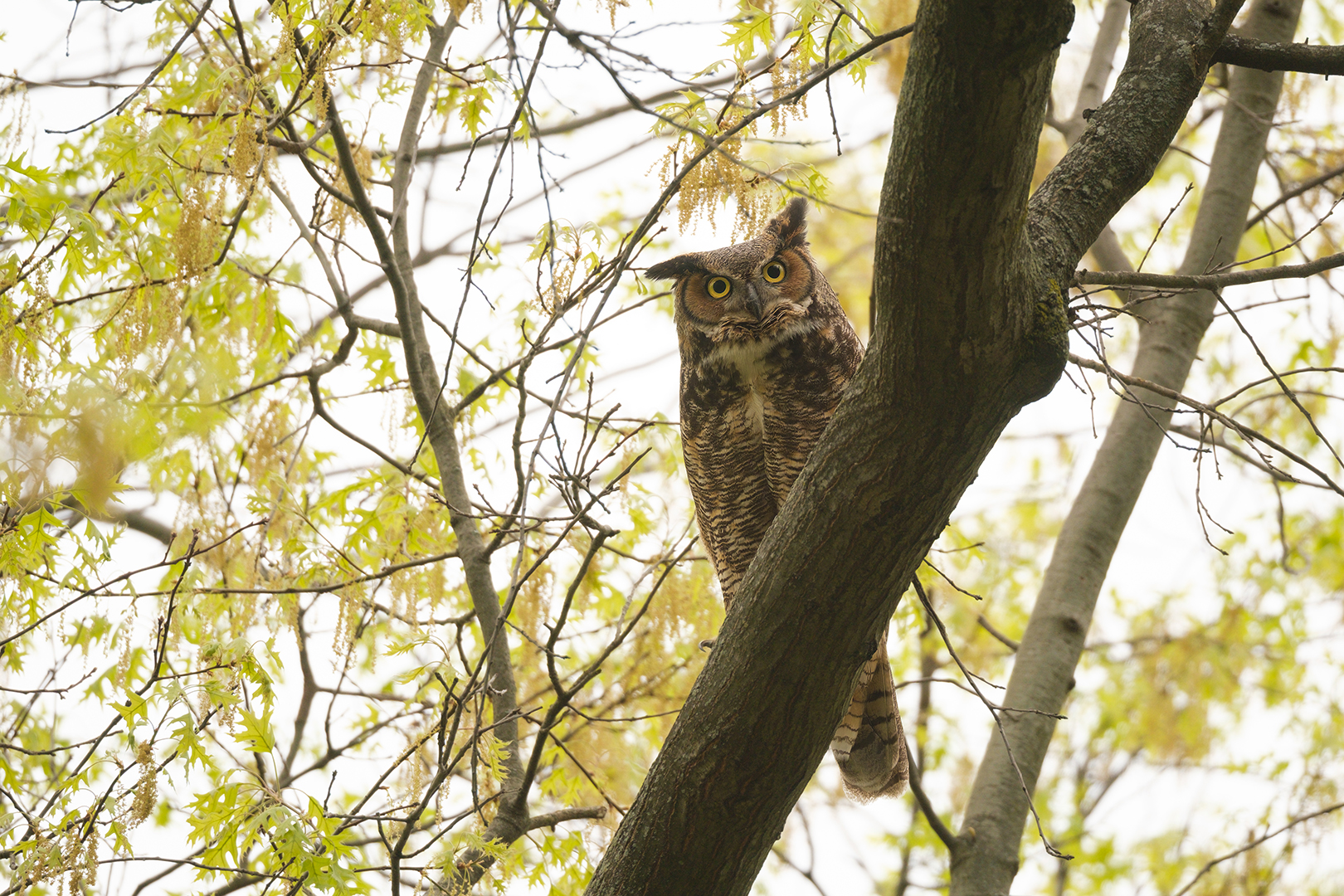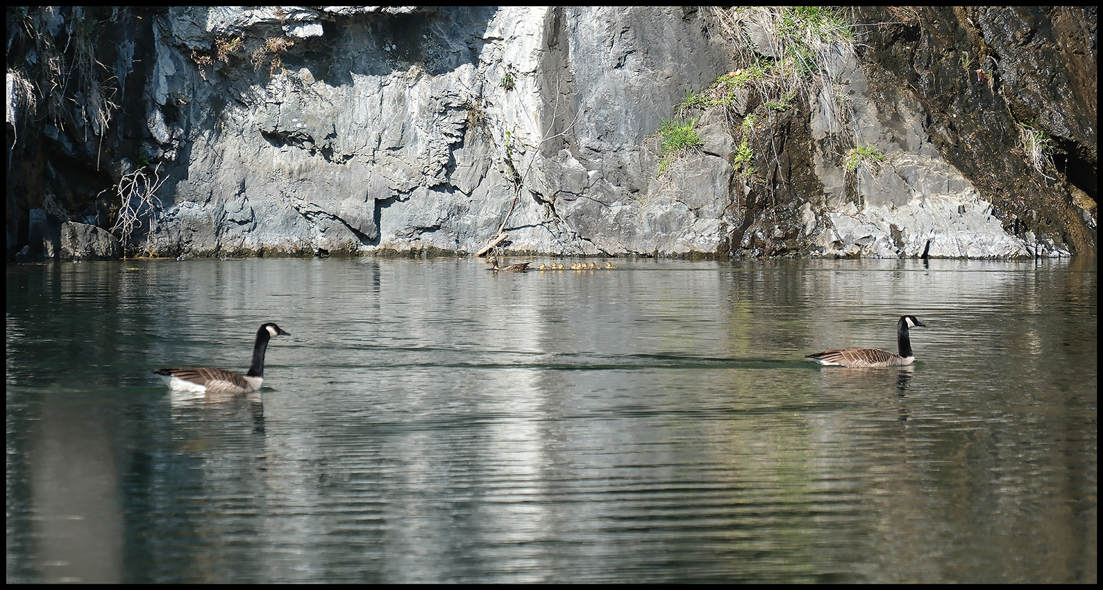 As we got up to the lake, the source of this point was quickly apparent. A pair of geese in the crystal clear, icy cold and very deep water. They likely have a nest somewhere in the woods along the shore of the lake. Uh oh!! A momma mallard and a clutch of tiny ducklings cruising along the base of the cliff.