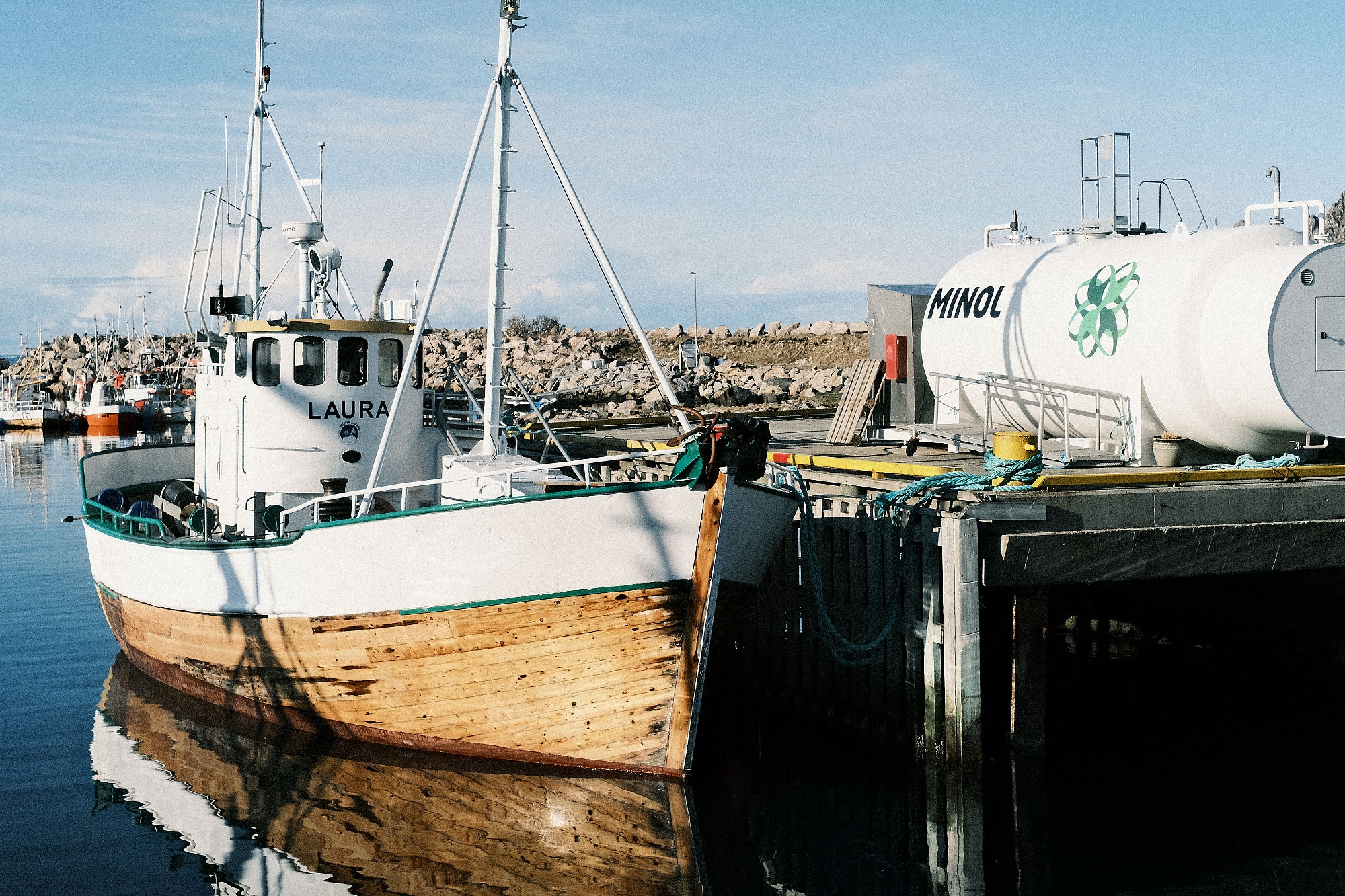 Nice shot, beautiful light and colors, I like the contrast between the boat and the tank on the right. A wider angle could have caught the full reflection of the boat in the water