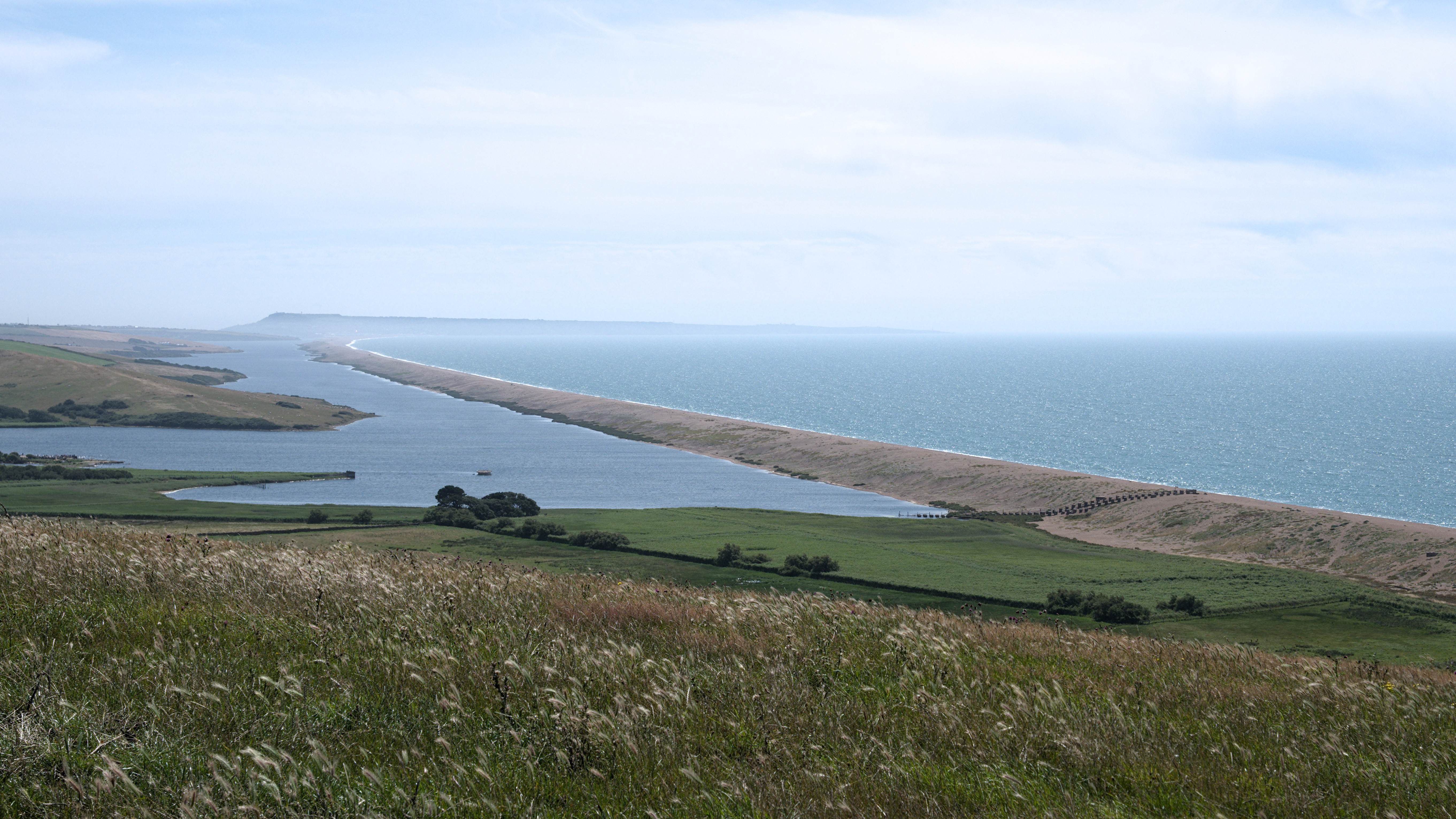 Abbotsbury sub-tropical gardens (Dorset, UK) and a view of the Chesil beach looking east towards Portland Bill...the blocks across the beach lower right are WW2 anti-invasion measures.